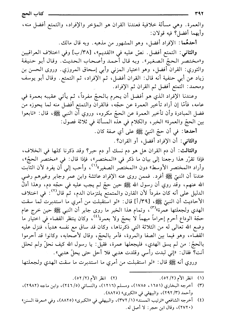 والثالث: أن دم القران هل هو دم نسك أو دم حبر؟ وقد ذكرنا كلها في الخلاف، فإذا تقرر هذا رجعنا إلى بيان ما ذكر في "المختصر"، فإذا قال: في "مختصر الحج"، وأراد "المختصر الأوسط" دون "المختصر الصغير" (¬1)، وأحب إلى أن يفرد لأن الثابت عندنا أن النبي صلى الله عليه وسلم أفرد. فممن روى عنه الإفراد عائشة وابن عمر وجابر وغيرهم رضي الله عنهم، وقد روي أن رسول الله صلى الله عليه وسلم حين حج لم يجب عليه في حجة دم، وهذا أدل الدليل على أنه كان مفرداً لأن القارن والمتمتع يلتزمان الدم، ثم قال (¬2): في اختلاف الأحاديث أن النبي صلى الله عليه وسلم، [39/أ] قال: "لو استقبلت من أمري ما استدبرت لما سقت الهدي ولجعلتها عمرة" (¬3)، وتمام هذا الخير ما روى جابر أن النبي صلى الله عليه وسلم حين خرج عام حجة الوداع أحرم إحراماً مبهماً لا يحج ولا بعمرة (¬4)، وكان ينتظر القضاء في اختيار ما وضع الله تعالى له من الثلاثة التي ذكرناها، وكان قد ساق مع نفسه هدياً، فنزل عليه القضاء، وهو فيما بين الصفا والمروة، فأمر بالحج، وقال لأصحابه، وكانوا قد أحرموا بالحج: من لم يسق الهدي، فليجعلها عمرة، فقيل: يا رسول الله كيف نحل ولم تحل أنت؟ فقال: "أني لبدت رأسي وقلدت هديي فلا أحل حتى يحل هديي".