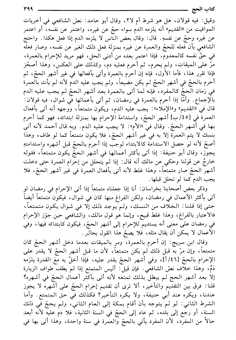 وذكر بعض أصحابنا بخراسان: أنا إذا جعلناه متمتعاً إذا أتى الإحرام في رمضان لو أتى بأكثر الأعمال في رمضان، ولكن الفراغ منها كان في شوال، فيكون متمتعاً أيضاً حتى إذا قلنا: الخلاف من النسك، ولم يوجد ذلك إلا في شوال يكون متمتعاً، الاعتبار بالفراغ، وهذا غلط قبيح، وإنما هو قول مالك، والشافعي حين جوز الإحرام في رمضان على معنى أنه يستديم للإحرام إلى أشهر الحج، فيكون كابتدائة فيها، وفي الأعمال لا يمكن أن يقال مثله، فلا يصح هذا القول بحال.