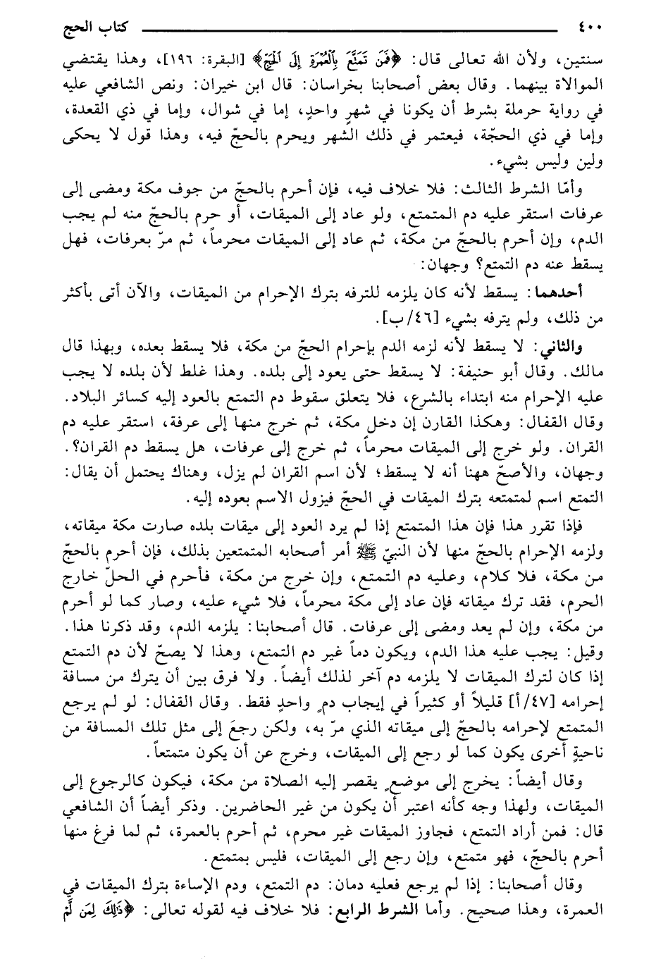 فإذا تقرر هذا فإن هذا المتمتع إذا لم يرد العود إلى ميقات بلده صارت مكة ميقاته، ولزمه الإحرام بالحج منها لأن النبي صلى الله عليه وسلم أمر أصحابه المتمتعين بذلك، فإن أحرم بالحج من مكة، فلا كلام، وعليه دم التمتع، وأن خرج من مكة، فأخرم غي الحل خارج الحرم، فقد ترك ميقاته فإن عاد إلى مكة محرماً، فلا شيء عليه، وصار كما لو أحرم من مكة، وإن لم يعد ومضى إلى عرفات. قال أصحابنا: يلزمه الدم، وقد ذكرنا هذا. وقيل: يجب عليه هذا الدم، ويكون دماً غير دم التمتع، وهذا لا يصح لأن دم التمتع إذا كان لترك الميقات لا يلزمه دم آخر لذلك أيضاً. ولا فرق بين أن يترك من مسافة إحرامه [47/أ] قليلاً أو كثيراً في إيجاب دم واحد فقط. وقال القفال: لو لم يرجع المتمتع لإحرامه بالحج إلى ميقاته الذي مر به، ولكن رجع إلى مثل تلك المسافة من ناحية أخرى يكون كما لو رجع إلى الميقات، وخرج عن أن يكون متمتعاً.