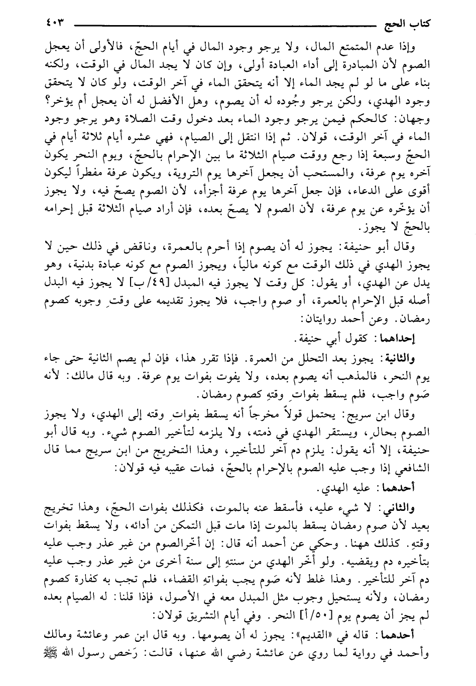 وقال أبو حنيفة: يجوز أن يصوم إذا أحرم بالعمرة, وناقض في ذلك حين لا يجوز الهدي في ذلك الوقت مع أنه ماليًا, ويجوز الصوم مع كونه عبادة بدنية, وهو بدل الهدي, أو يقول: كل وقت لا يجوز فيه المبدل [49/ ب] لا يجوز فيه البدل أصله قبل الإحرام بالعمرة, أو صوم ولجب, فلا يجوز تقديمه على وقتِ وجوبه كصوم رمضان. وعن أحمد روايتان: