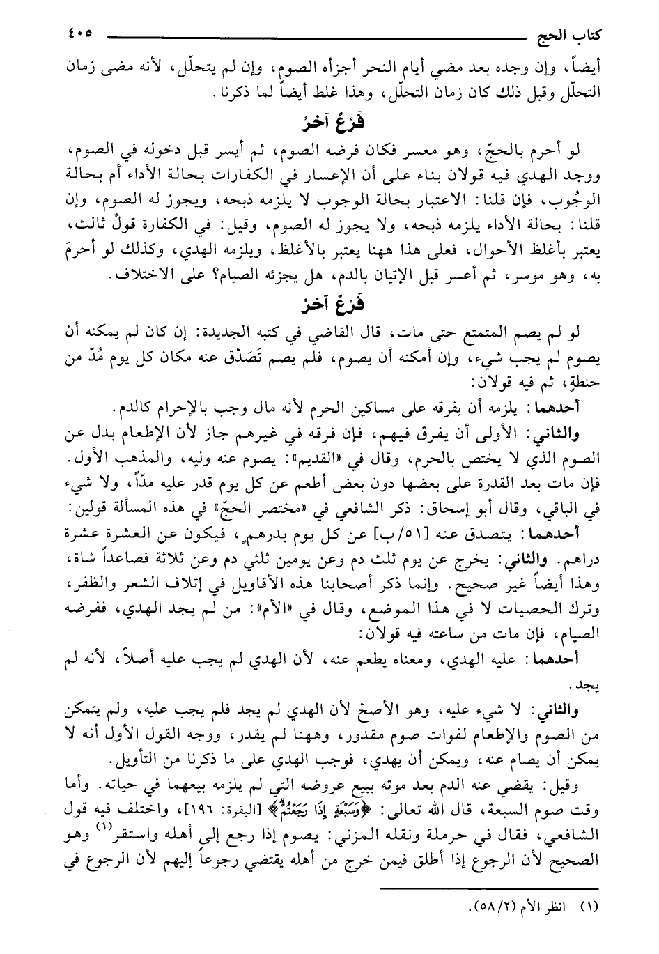 وقيل: يقضي عنه الدم بعد موته ببيع عروضه التي لم يلزمه بيعهما في حياته. وأما وقت صوم السبعة, قال تعالى: {وسَبْعَةٍ إذَا رَجَعْتُمْ} [البقرة: 196] , واختلف فيه قول الشافعي, فقال حرملة ونقلة المزني: يصوم إذا رجع إلى أهله واستقر (¬1) وهو الصحيح لأن الرجوع إذا أطلق فيمن خرج من أله يقتضي رجوعًا إليهم لأن الرجوع في