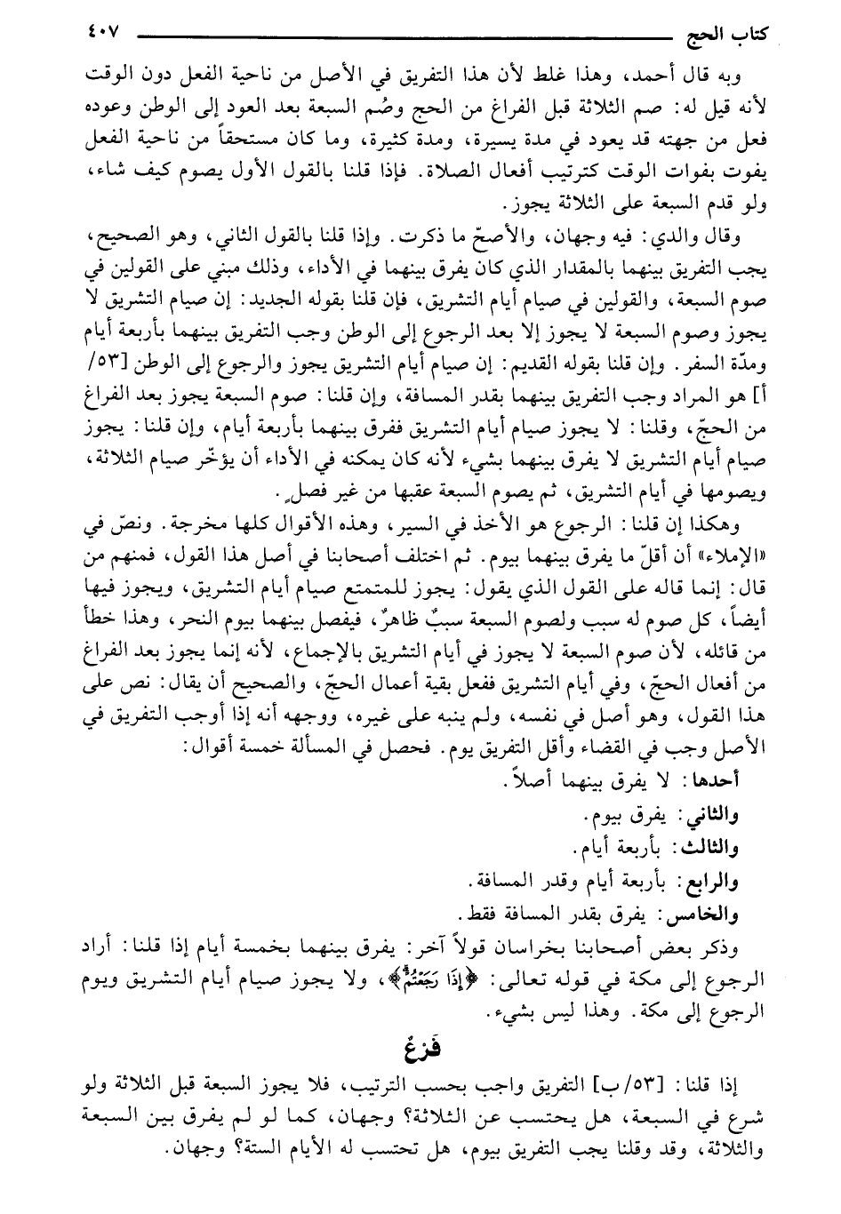 وهكذا إن قلنا: الرجوع هو الأخذ في السير, وهذه الأقوال كلها مخرجة. ونصّ في "الإملاء" أن أقلّ ما يفرق بينهما بيوم. ثم اختلف أصحابنا في أصل هذا القول, فمنهم من قال: إنما قاله على القول الذي يقول: يجوز للمتمتع صيام أيام التشريق, ويجوز فيها أيضًا, كل صوم له سبب ولصوم السبعة سببٌ ظاهرٌ, فيفصل بينهما بيوم النحر, وهذا خطأ من قائله, لأن صوم السبعة لا يجوز في أيام التشريق بالإجماع, لأنه إنما يجوز بعد الفراغ من أفعال الحجّ, وفي أيام التشريق ففعل بقية أعمال الحجّ, والصحيح أن يقال: نص على هذا القول, وهو أصل في نفسه, ولم ينبه على غيره, ووجهه أنه إذا أوجب التفريق في الأصل وجب في القضاء وأقل التفريق يوم. فحصل في المسألة خمسة أقوال: