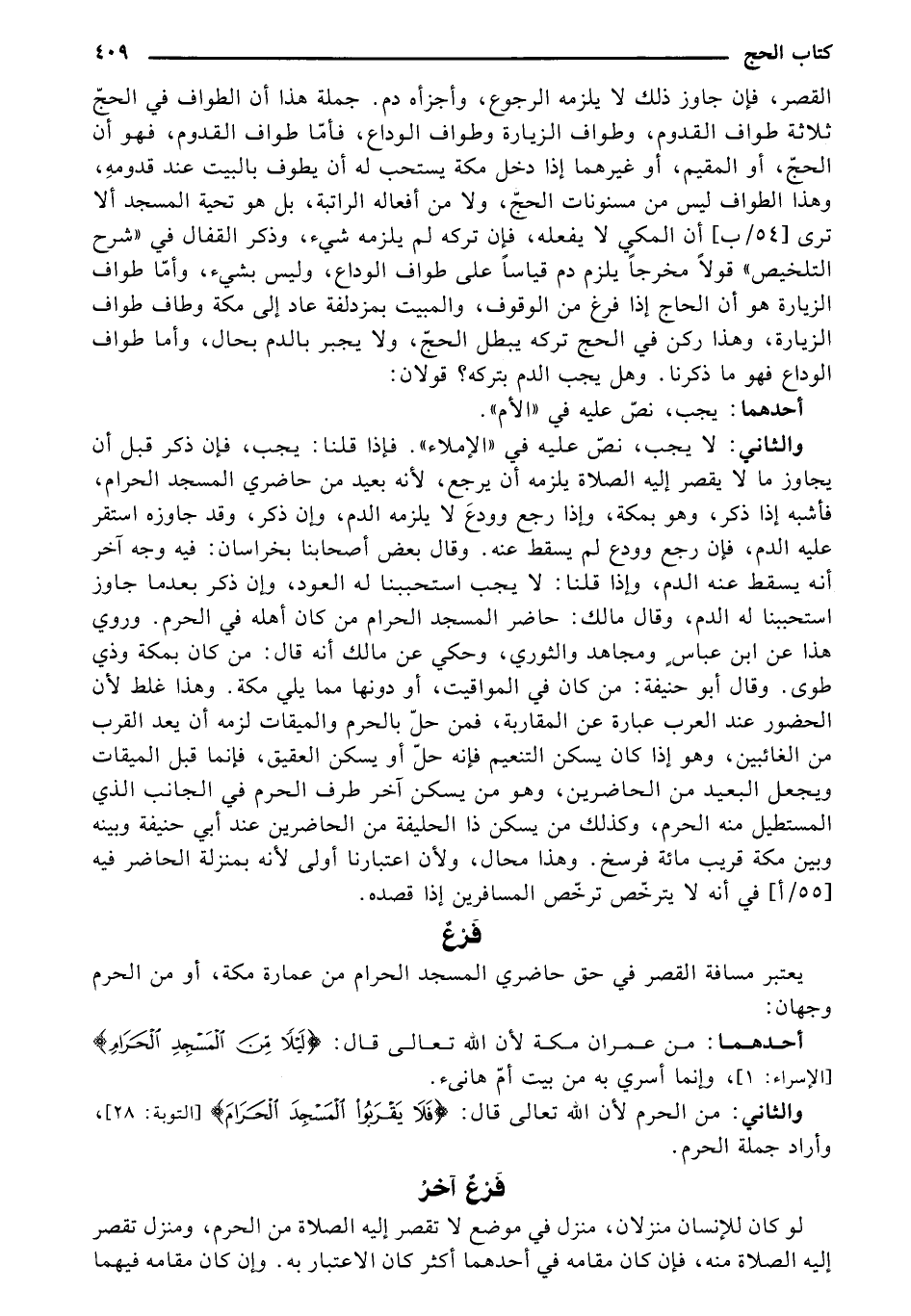 والثاني: لا يجب، نصّ عليه في "الإملاء". فإذا قلنا: يجب، فإن ذكر قبل أن يجاوز ما لا يقصر إليه الصلاة يلزمه أن يرجع، لأنه بعيد من حاضري المسجد الحرام، فأشبه إذا ذكر، وهو بمكة، وإذا رجع وودعَ لا يلزمه الدم، وإن ذكر، وقد جاوزه استقر عليه الدم، فإن رجع وودع لم يسقط عنه. وقال بعض أصحابنا بخراسان: فيه وجه آخر أنه يسقط عنه الدم، وإذا قلنا: لا يجب استحببنا له العود، وإن ذكر بعدما جاوز استحببنا له الدم، وقال مالك: حاضر المسجد الحرام من كان أهله في الحرم. وروي هذا عن ابن عباسٍ ومجاهد والثوري، وحكي عن مالك أنه قال: من كان بمكة وذي طوي. وقال أبو حنيفة: من كان في المواقيت، أو دونها مما يلي مكة. وهذا غلط لأن الحضور عند العرب عبارة عن المقاربة، فمن حلّ بالحرم والميقات لزمه أن يعد القرب من الغائبين، وهو إذا كان يسكن التنعيم فإنه حلّ أو يسكن العقيق، فإنما قبل الميقات ويجعل البعيد من الحاضرين، وهو من يسكن ذا الحليفة من الحاضرين عند أبي حنيفة وبينه وبين مكة قريب مائة فرسخ. وهذا محال، ولأن اعتبارنا أولي لأنه بمنزلة الحاضر فيه [55/أ] في أنه لا يترخّص ترخّص المسافرين إذا قصده.