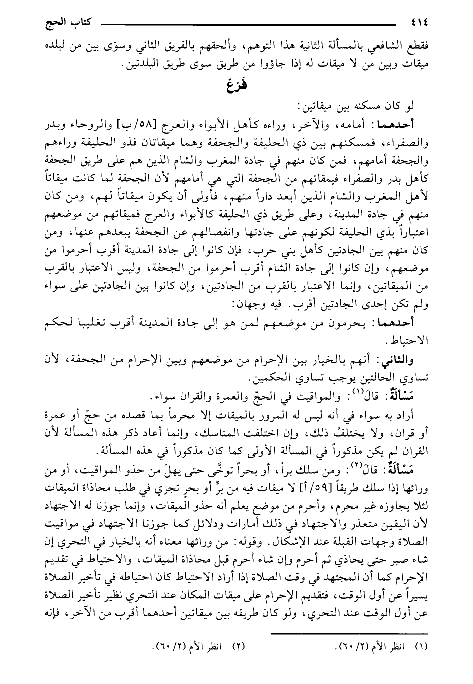فقطع الشافعي بالمسألة الثانية هذا التوهم، وألحقهم بالفريق الثاني وسوى بين من لبلده ميقات وبين من لا ميقات له إذا جاؤوا من طريق سوى طريق البلدتين.