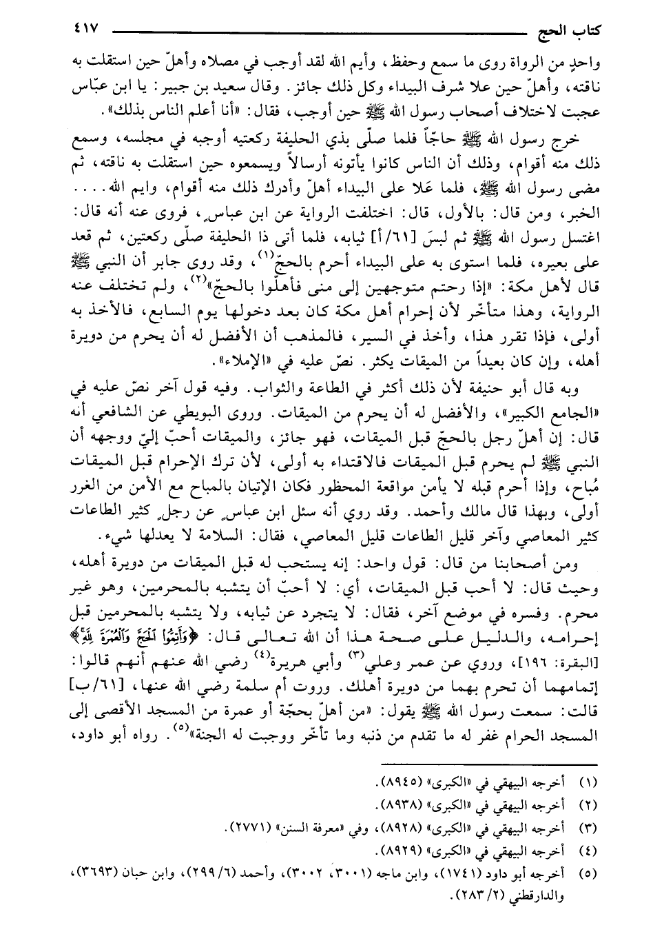 ومن أصحابنا من قال: قول واحد: إنه يسحب له قبل الميقات من دويرة أهله، وحيث قال: لا أحب قبل الميقات، أي: لا يتجرد عن ثيابه، ولا يتشبه بالمحرمين قبل إحرامه، والدليل على صحة هذا ان الله تعالي قال: {وأَتِمُّوا الحَجَّ والْعُمْرَةَ لِلَّهِ} [البقرة: 196]، وروي عن عمر وعلي (¬3) وأبي هريرة (¬4) رضي الله عنهم أنهم قالوا: إتمامهما أن تحرم بهما من جويرة أهلك. وروت أم سلمة رضي الله عنها، [61/ب] قالت: سمعت رسول الله صلى الله عليه وسلم يقول: "من أهل حجة أو عمرة من المسجد الأقصى إلي المسجد الحرام غفر له ما تقدم من ذنبه وما تأخر ووجبت له الجنة" (¬5). رواه أبو داود،