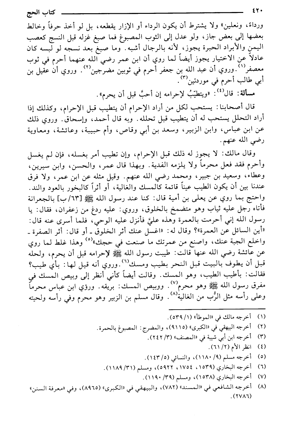 ورداء، ونعلين" ولا يشترط أن يكون الرداء أو الإزار يقطعه، بل لو أخذ حرفًا وخالط بعضها إلى بعض جاز، ولو عدل الثوب المصبوغ فما صبغ غزله قبل النسج كعصب اليمن والأبراد الحبرة يجوز، لأنه بالرجال أشبه. وما صبغ بعد نسجه لو لبسه كان عادلًا عن الاختيار يجوز أيضًا لما روي أن ابن عمر رضي الله عنهما أحرم في ثوب معصفر (¬1). وروي أن عبدالله بن جعفر أحرم في ثوبين مضرجين (¬2). وروي أن عقيل بن أبي طالب أحرم في موردتين (¬3).
