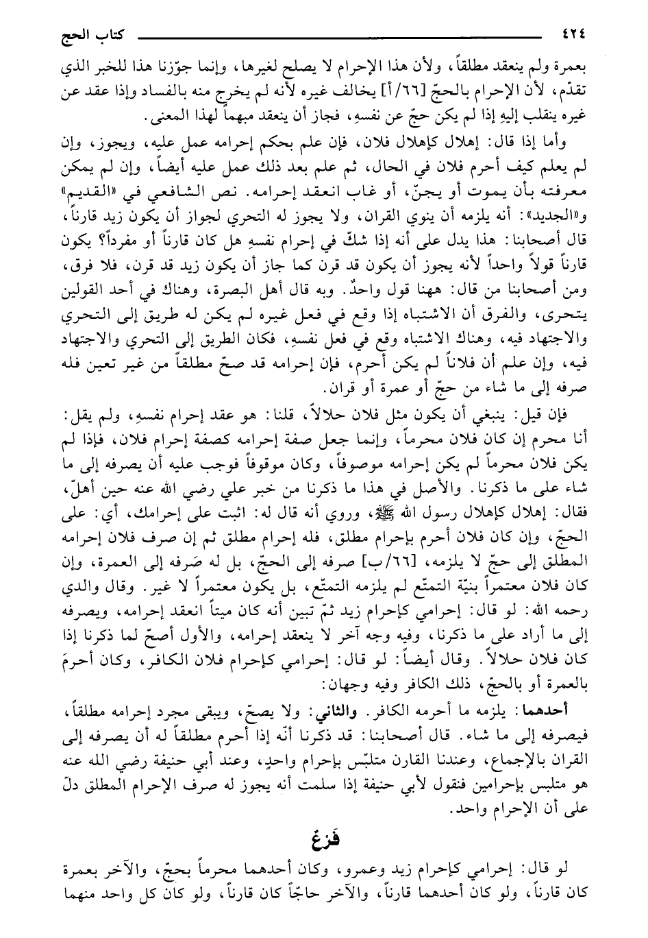 فإن قيل: ينبغي أن يكون مثل فلان حلالا، قلنا: هو عقد إحرام نفسهِ، ولم يقل: أنا محرم إن كان فلان محرمًا، هما جعل صفة إحرامه كصفةً إحرام فلان، فإذا لم يكن فلان محرمًا لم يكن إحرامه موصوفًا، وكان موقوفًا فوجب عليه أن يصرفه إلى ما شاء على ما ذكرنا. والأصل في هذا ما ذكرنا من خبر علي رضي الله عنه حين أهل، فقادت إهلال كإهلال رسول الله - صلى الله عليه وسلم -، وروي أنه قال له: ائت على إحرامك، أي- صلى الله عليه وسلم - على الحج، وإذا كان فلان أحرم بإحرام مطلق، فله إحرام مطلق ثم إن صرف فلان إحرامه المطلق إلى حج لا يلزمه، [(86) /ب] صرفه إلى الحج، بل له صرفه إلى العمرةً، وإن كان فلان معتمرًا بنيةً التمني لم يلزمه التمني، بل يكون معتمرًا لا غير، وقال والدي رحمه الله: لو قادت إحرامي كإحرام زيد نم تبين أنه كان ميتًا انعقد إحرامه، ويصرفه إلى ما أراد على ما ذكرنا، وفيه وجه آخر لا ينعقد إحرامه، والأول أصح لما ذكرنا إذا كان فلان حلالا. وقال أيضًا: لو قال: إحرامي كإحرام فلان الكافر، وكان أحرامه بالعمرة أو بالحج، ذلك الكافر وفيه وجهان:
