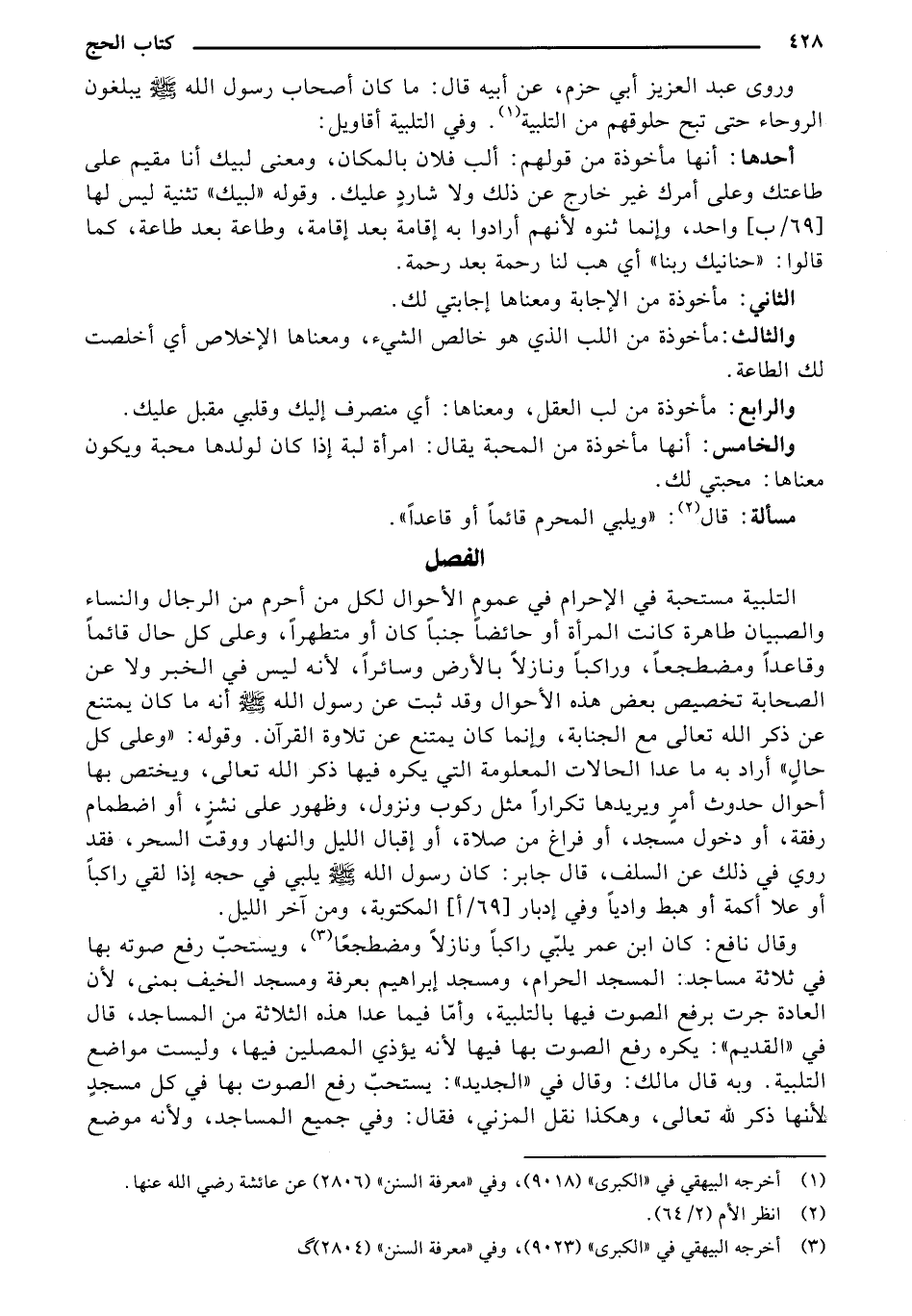 وروى عبد العزيز أبي حزم، عن أبيه قال: ما كان أصحاب رسول الله - صلى الله عليه وسلم - يبلغون الروحاء حتى تبح حلوقهم من التلبية (¬1) وفي التلبية أقاويل: