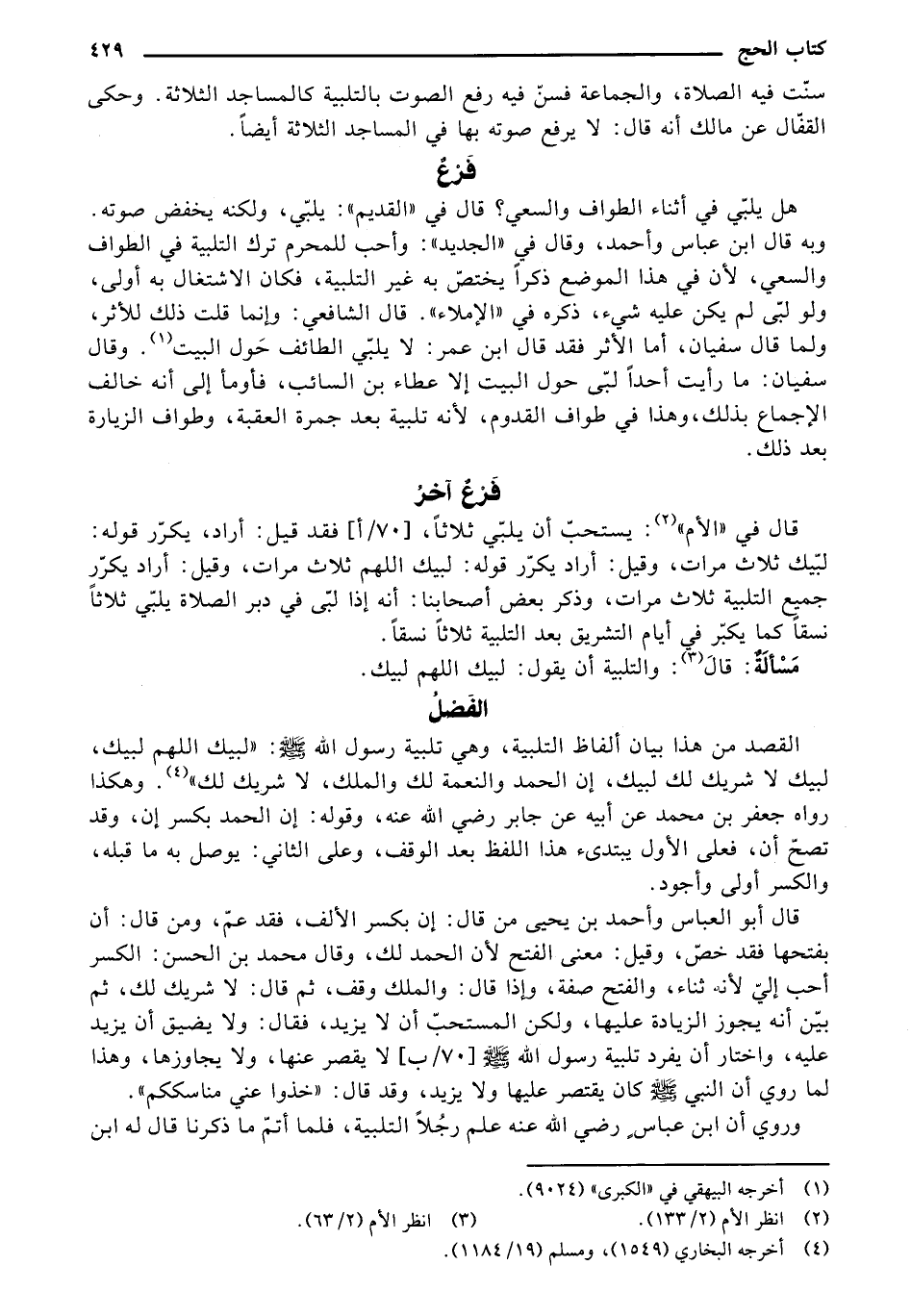 القصد من هذا بيان ألفاظ التلبيةَ، وهي تلبية رسول الله - صلى الله عليه وسلم -: "لبيك اللهم لبيكَ، لبيك لا شريك لكَ لبيك، إن الحمد والنعمةَ لكْ والملك، لا شريك لكَ" (¬4). وهكذا رواه جعفر بن محمد عن أبيه عن جابر رض الله عنه، وقوله: إن الحمد بكسر إن؛ وقد تصح أن، فعلى الأول يبتدئ هذا اللفظ بعد الوقف، وعلى الثاني: يوصل به ما قبله، والكسر أولى وأجود.