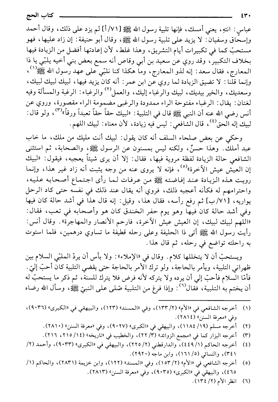 وحكي عن بعض صلحاء السلف أنه كان يقول: لبيك أنت مليك من ملك، ما خاب عبد أملك. وهذا حسن، ولكنه ليس بمسنون عن الرسول - صلى الله عليه وسلم -، والصحابة، ثم استثنى الشافعي حالةَ الزيادةً لفظةَ مرويةً فيها، فقادت إلا أن يرى شيئًا يعجبه، فيقول: " لبيك إن العيش عيش الآخرة" (¬5)، فإنه لا يروى عنه من وجه يثبت أنه زاد غير هذا، وإنما رويت هذه الزيادةَ عند إفاضته من عرفات لما رأى اجتماع أصحابه عليه، واحترامهم له فكأنه أعجبه ذلك، فروي أنه يقال عند ذلك في نفسه حتى كاد الرحل يواريه، [71/ ب] ثم رفع رأسه، فقال هذا: وقيل: إنه قال هذا في أشد حالةً كان فيها وفي أشد حالةً كان فيها وهو يوم حفر الخندق كان هو وأصحابه في تعب، فقال: "اللهم لبيك لبيك، إن العيش عيش الآخرةً، فارحم الأنصار والمهاجرةً". وقال أنس: رأيت رسول الله - صلى الله عليه وسلم - أتى ذا الحليفةَ وعلى رحله قطيفةُ ما تساوي درهمين، فلما استوت به راحلته تواضع في رحله، ثم قال هذا.