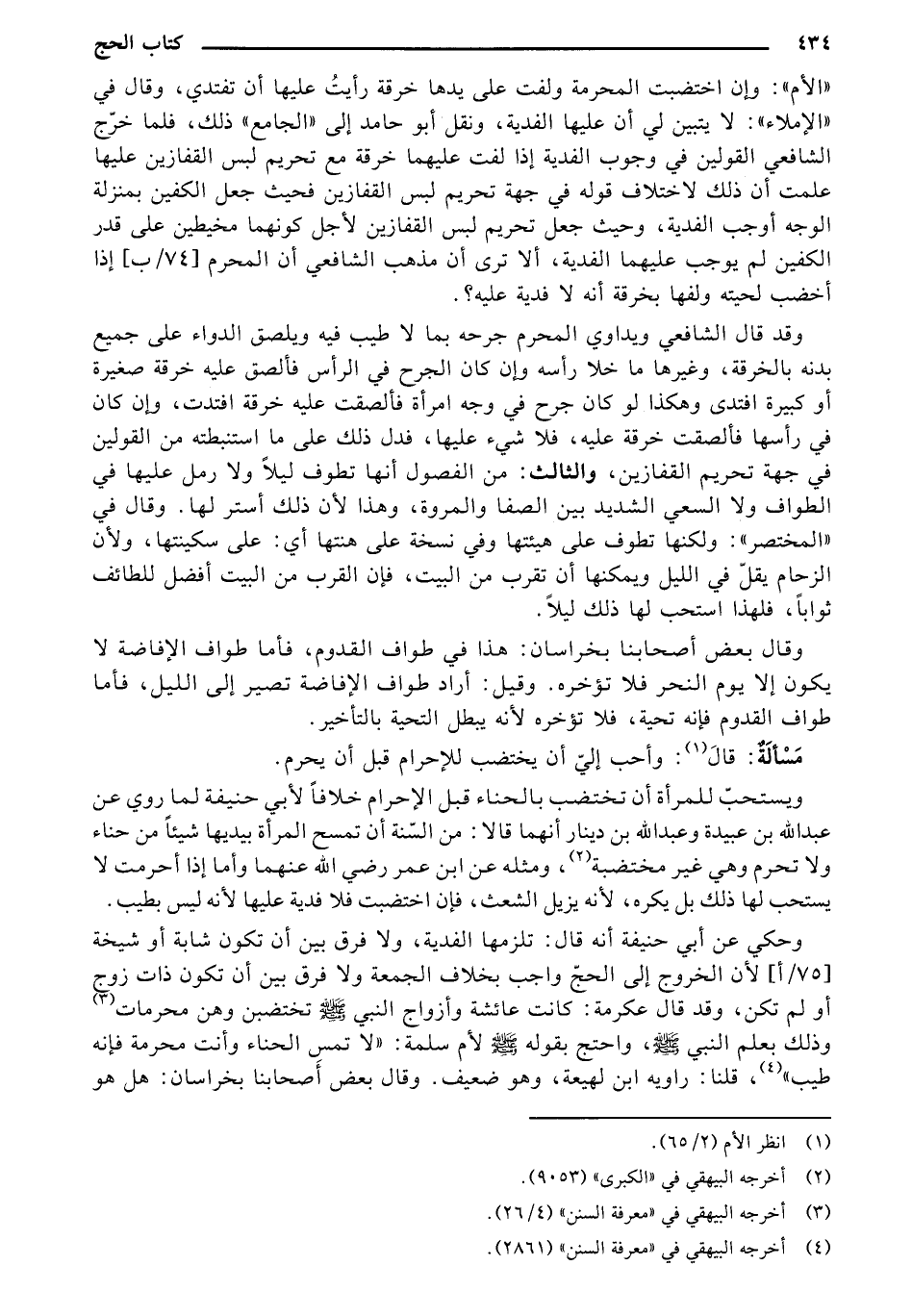 "الأم " وإن اختضبت المحرمةَ ولفت على يدها خرقةً رأيت عليها أن تفتدي، وقال في "الإملاء": لا يتبين لي أن عليها الفديةَ، ونقل أبو حامد إلى "الجامع" ذلك، فلما خرج الشافعي القولين في وجوب الفديةً إذا لفت عليهما خرقةً مع تحريم لبس القفازين عليها علمت أن ذلك لاختلاف قوله في جهةَ تحريم لبس القفازين فحيث جعل الكفين بمنزلةُ الوجه اوجب الفديةَ، وحيث جعل تحريم لبس القفازين لأجل كونهما مخيطين على قدر الكفين لم يوجب عليهما الفديةً، ألا ترى أن مذهب الشافعي أن المحرم [74/ ب] إذا أخضب لحيته ولفها بخرقة أنه لا فدية عليه؟