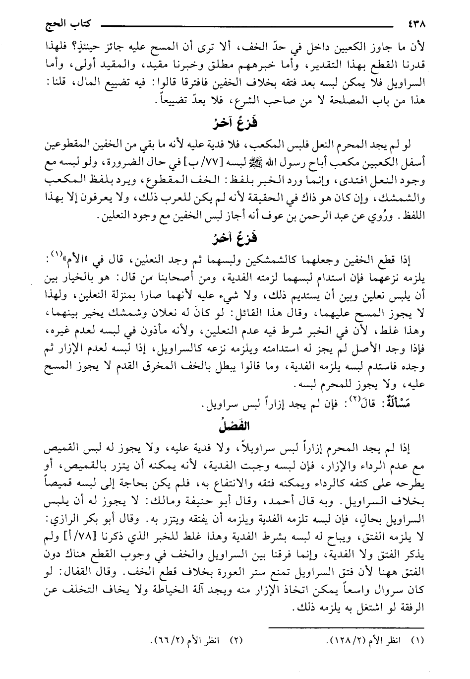 لأن ما جاوز الكعبين داخل في حدٌ الخف، ألا ترى أن المسح عليه جائز حينئذ؟ فلهذا قدرنا القطع بهذا التقدير، وأما خبرههم مطلق وخبرنا مقيد، والمقيد أولى، وأما السراويل فلا يمكن لبسه بعد فتقه بخلاف الخفين فافترقا قالوا: فيه تضيع المال، قلنا: هذا من باب المصلحةَ لا من صاحب الشمع، فلا يعن تضييعًا.