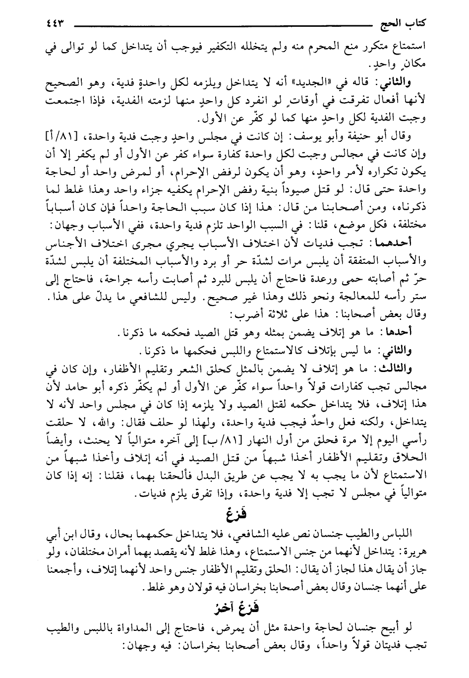 والثالث: ما هو إتلاف لا يضمن بالمثل كحلق الشعر وتقليم الأظفار، وإن كان في مجالس تجب كفارات قولًا واحدًا سواء كفّر عن الأول أو لم يكفّر ذكره أبو حامد لأن هذا إتلاف، فلا يتداخل حكمه لقتل الصيد ولا يلزمه إذا كان في مجلس واحد لأنه لا يتداخل، ولكنه واحدٌ فيجب فدية واحدة، ولهذا لو حلف فقال: والله، لا حلقت رأسي اليوم إلا مرة فحلق من أول النهار [81/ ب] إلى آخره متواليًا لا يحنث، وأيضًا الحلاق وتقليم الأظفار أخذ شبهًا من قتل الصيد في أنه إتلاف وأخذا شبهًا من الاستمتاع لأن ما يجب به لا يجب عن طريق البدل فألحقنا بهما، فقلنا: إنه إذا كان متواليًا في مجلس لا تجب إلا فدية واحدة، وإذا تفرق يلزم فديات.