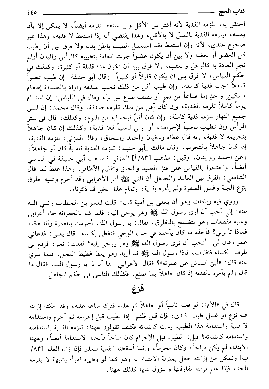 احتقن به، تلزمه الفدية لأنه أكثر من الأكل ولو استعط تلزمه أيضًا، لا يمكن إلا بأن يمسه، فيلزمه الفدية بالمسّ لا بالأكل، وهذا يقتضي أنه استعط لا فدية، وهذا غير صحيح عندي، لأنه وإن استعط فقد استعمل الطيب باطن بدنه ولا فرق بين أن يطيب كل عضو أو بعضه ولا بين أن يكون عضوًا جرت العادة بتطييبه كالرأس والبدن أو لم تجر العادة به كالرجل والعقب، ولا فرق بين أن تكون مدة قليلة أو كثيرة، وكذلك في حكم اللباس، لا فرق بين أن يكون قليلًا أو كثيرًا. وقال أبو حنيفة: إن طيب عضوًا كاملًا تجب فدية كاملة، وإن طيب أقل من ذلك تجب صدقة وأراد بالصدقة إطعام مسكينٍ واحدٍ إما صاعًا من تمرٍ أو نصف صاع من برّ، وقال في اللباس: إن استدام يومًا كاملًا تلزمه الفدية، وإن كان أقل من ذلك تلزمه صدقة، وقال محمد: إن لبس جميع النهار تلزمه فدية كاملة، وإن كان أقل فبحسبانه من اليوم، وكذلك، قال في ستر الرأس وإن تطيب ناسيًا لإحرامه، أو لبس ناسيًا فلا فدية، وكذلك إن كان جاهلًا بتحريمه لا فدية، وبه قال عطاء وسفيان وأحمد وإسحاق، وقال المزني: تلزمه الفدية، إذا كان جاهلًا بالتحريم، وقال مالك وأبو حنيفة: تلزمه الفدية ناسيًا كان أو جاهلًا، وعن أحمد روايتان، وقيل: مذهب [83/ أ] المزني كمذهب أبي حنيفة في الناسي أيضًا. واحتجوا بالقياس على قتل الصيد والحلق وتقليم الأظافر، وهذا غلط لما قال الشافعي: الفرق بين العامد والجاهل أن النبي صلى الله عليه وسلم أمر الأعرابي وقد أحرم وعليه خلوق بنزع الجبة وغسل الصفرة ولم يأمره بفدية، وتمام هذا الخبر قد ذكرناه.