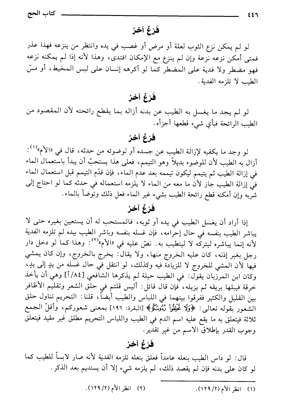 إذا أراد أن يغسل الطيب في يده أو ثوبه، فالمستحب له أن يستعين بغيره حتى لا يباشر الطيب بنفسه في حال إحرامه، فإن غسله بنفسه وباشر الطيب بيده لم تلزمه الفدية لأنه إنما يباشره ليتركه لا ليتطيب به. نصّ عليه في "الأم" (¬2): وهذا كما لو دخل دار رجل بغير إذنه، كان عليه الخروج منها، ولا يقال: يخرج بالخروج، وإن كان يمشي فيها لأن المشي للخروج لا للزيادة فيه وكذلك، لو انتقل في حال غسله من يدٍ إلى يدٍ، وكان ابن المرزبان يقول: في الطيب حيلة لم يذكرها الشافعي [84/ أ] وهي أن يأخذ خرقة فيبلها بريقه ثم يزيله، فإن قال قائل: أليس قلتم في حلق الشعر وتقليم الأظافر بين القليل والكثير ففرقوا بينهما في اللباس والطيب أيضًا، قلنا: التحريم تناول حلق الشعور بقوله تعالى: {وَلَا تَحْلِقُوا رُءُوسَكُمْ} [البقرة: 196] بمعنى شعوركم، وأقلّ الجمع ثلاثة فيتعلق به ما يقع عليه اسم الدم في الطيب واللباس التحريم مطلق غير مقيد فيتعلق وجوب القدر بإطلاق الاسم من غير تقدير.