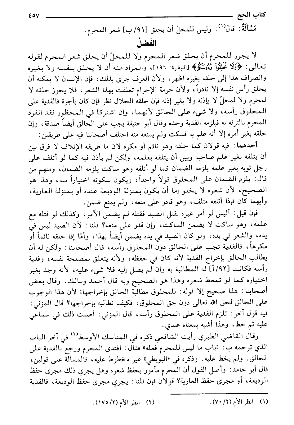وقال القاضي الطبري رأيت الشافعي ذكره في المناسك الأوسط (¬2) في أخر الباب الذي ترجمه ب: "باب ما ليس للمحرم فعله" فقال: افتدى المحرم ورجع بالفدية على الحالق. ولم يخط عليه. وذكره في "البويطى" غير مخطوط عليه, فالمسألة على قولين, قال أبو حامد: وأصل القول أن المحرم مأمور بحفظ شعره وهل يجرى ذلك مجرى حفظ الوديعة, أو مجرى حفظ العارية؟ قولان فإن قلنا: يجرى مجرى حفظ الوديعة, فالفدية
