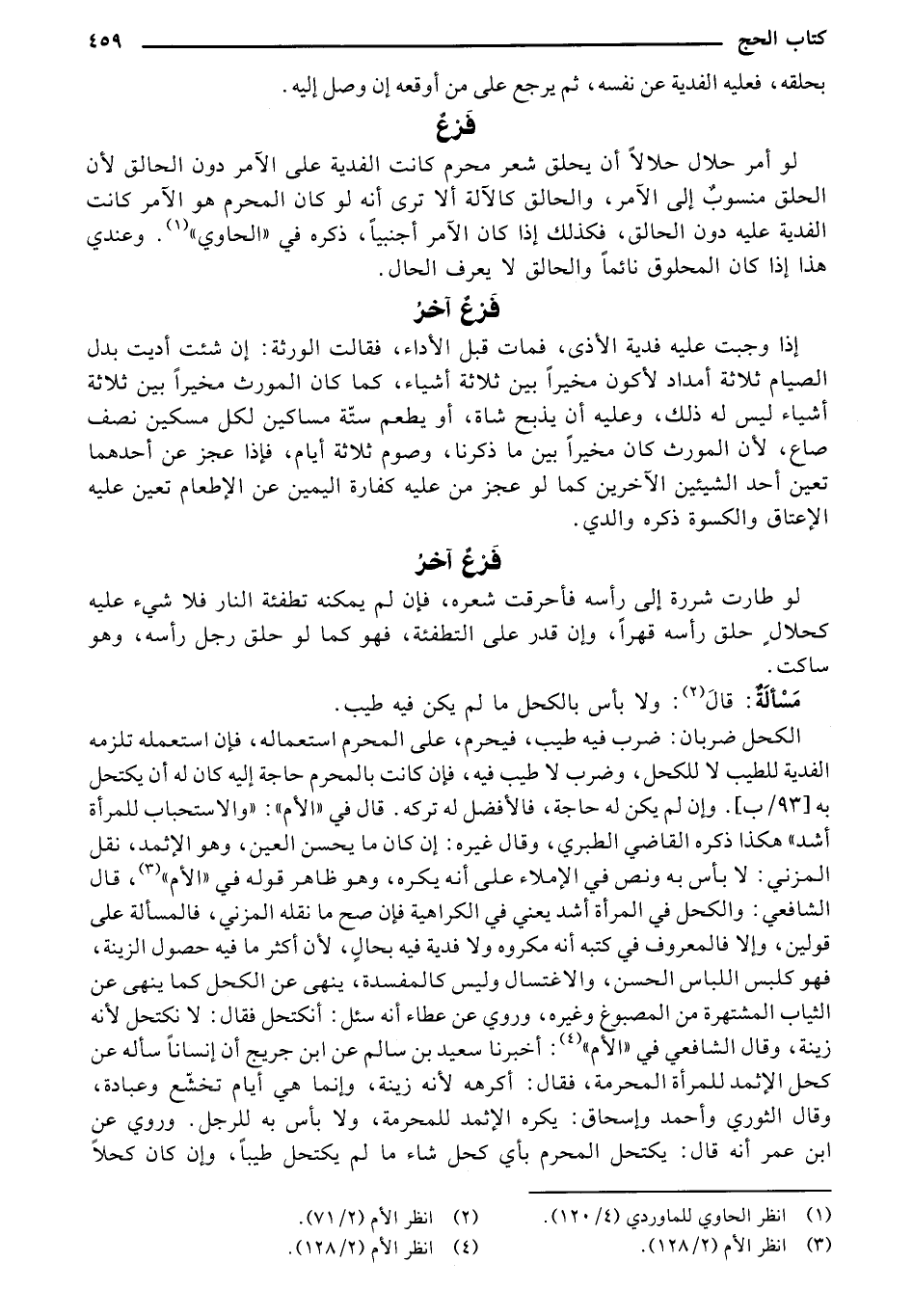 الكحل ضربان: ضرب فيه طيب, فيحرم على المحرم استعماله, فإن استعمله تلزمه الفدية للطيب لا للكحل, وضرب لا طيب فيه, فإن كانت بالمحرم حاجة إليه كان له أن يكتحل به [93/ب]. وان لم يكن له حاجة, فالأفضل له تركه. قال في "الأم": " والاستحباب للمرأة أشد" هكذا ذكره القاضي الطبري, وقال غيره: إن كان ما يحسن العين, وهو الإثمد, نقل المزني: لا بأس به ونص في الإملاء على أنه يكره, وهو ظاهر قوله في "الأم" (¬3)، قال الشافعي: والكحل في المرأة أشد يعنى في الكراهية فإن صح ما نقله المزني, فالمسألة على قولين, وإلا فالمعروف في كتبه أنه مكروه ولا فدية بحال, لأن أكثر ما فيه حصول الزينة, فهو كلبس اللباس الحسن, والاغتسال وليس كالمفسدة, ينهى عن الكحل كما ينهى عن الثياب المشتهرة من المصبوغ وغيره, وروى عن عطاء أنه سئل: أنكتحل فقال: لا نكتحل لأنه زينة, وقال الشافعي في "الأم" (¬4): أخبرنا سعيد بن سالم عن ابن جريج أن إنساناً سأله عن كحل الإثمد للمرأة المحرمة, فقال: أكرهه لأنه زينة, وإنما هي أيام تخشع وعبادة, وقال الثوري وأحمد وإسحاق: يكره الإثمد للمحرمة, ولا بأس به للرجل. وروى عن ابن عمر أنه قال: يكتحل المحرم بأي كحل شاء ما لم يكتحل طيباً, وإن كان كحلا