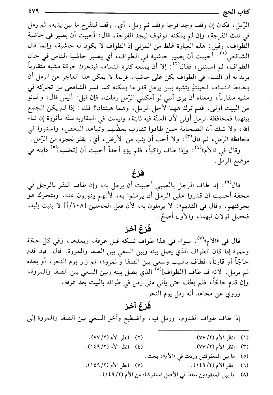 الرَمل، فكان إن وقف وجد فرجة وقف ثم رمل، أي: وقف لينفرج ما بين يديه، ثم رمل في تلك الفرجة، وإن لم يمكنه الوقوف ليجد الفرجة، قال: أحببت أن يصير في حاشية الطواف، وقيل: هذه العبارة غلط من المزني إذ الطواف لا يكون له حاشية، وإنما قال الشافعي (¬1): أحببت أن يصير حاشية في الطواف، أي يصير حاشية الناس في حال الطواف، ثم استثني، فقال (¬2): إلا أن يمنعه كثرة النساء، فيتحرك حكرة مشية متقاربًا يريد به أن النساء في الطواف يكن على حاشية، فربما لا يمكن هذا العاجز عن الرمل أن يخالط النساء، فحينئذٍ يتشبه بمن يرمل قدر ما يمكنه كما فسر الشافعي من تحركه في مشيه متقاربًا، ومعناه أن يرى أنني لو أمكنني الرّمل رملت، فإن قيل: أليس قال: والدنو من البيت أولى، فلم ترك ههنا لأجل الرمل، وهما هيئتان؟ قلنا: إذا لم يكن الجمع بينهما فمحافظة الرمل أولى لأن السنّة فيه ثابتة، وليست في المقاربة سنّة مأثورة إن شاء الله، ولا شك أن الصحابة حين طافوا تقارب بعضُهم وتباعد البعض، واستووا في محافظة الرّمل، ثم قال (¬3): ولا أحب أن يثب من الأرض، أي: يقفز لعجزه من الرّمل.