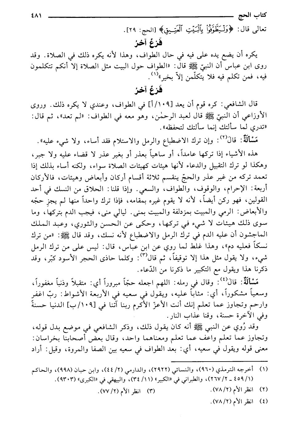 يكره أن يضع يده على فيه في حال الطواف، وهذا لأنه يكره ذلك في الصلاة. وقد روى ابن عباس أن النبي صلى الله عليه وسلم قال: "الطواف حول البيت مثل الصلاة إلا أنكم تتكلمون فيه، فمن تكلم فيه فلا يتكلّمن إلاّ بخير" (¬1).
