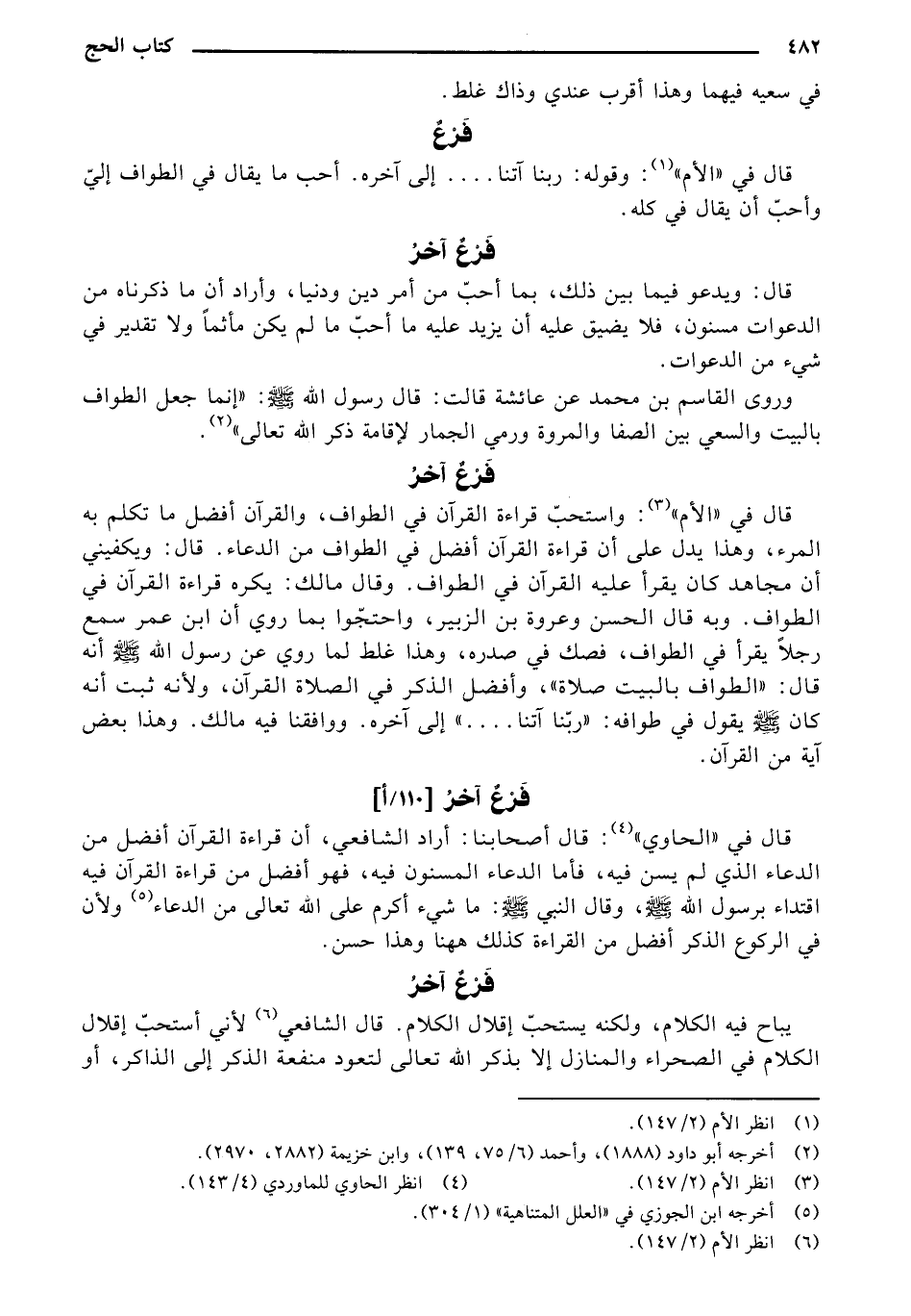 يباح فيه الكلام، ولكنه يستحبّ إقلال الكلام. قال الشافعي (¬6) لأني أستحبّ إقلال الكلام في الصحراء والمنازل إلا بذكر الله تعالى لتعود منفعة الذكر إلى الذاكر، أو