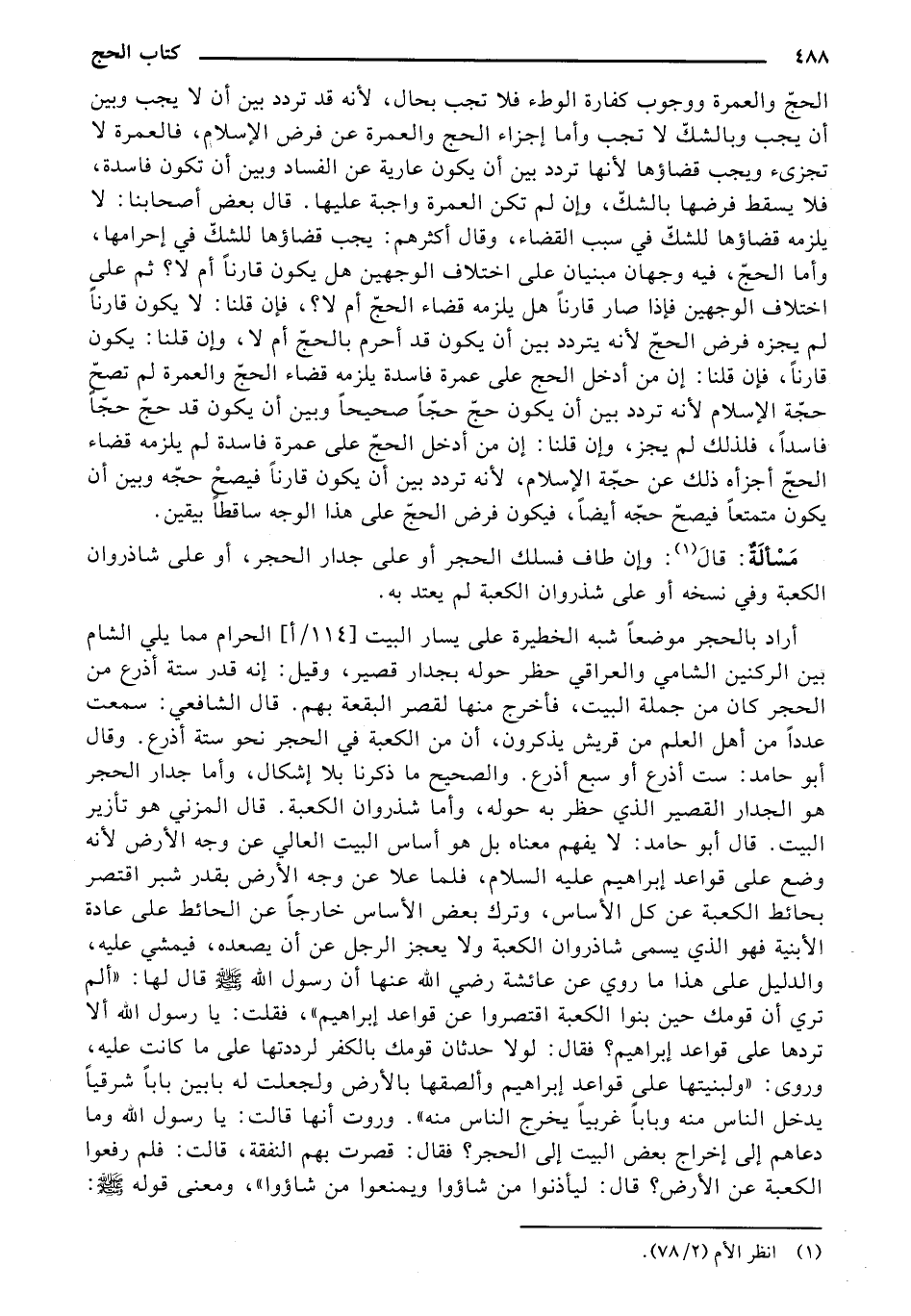 أراد بالحجر موضعًا شبه الخطيرة على يسار البيت [114/أ] الحرام مما يلي الشام بين الركنين الشاميي والعراقي حظر حوله بجدار قصير، وقيل: إنه قدر ستة أذرع من الحجر كان من جملة البيت، فأخرج منها لقصر البقعة بهم. قال الشافعي: سمعت عددًا من أهل العلم من قريش يذكرون، أن من الكعبة في الحجر نحو ستة أذرع. وقال عددًا من أهل العلم من قريش يذكرون، أن من الكعبة في الحجر نحو ستة أذرع. وقال أبو حامد: ست أذرع أو سبع أذرع. والصحيح ما ذكرنا بلا إشكال، وأما جدار الحجر هو الجدار القصير الذي حظر به حوله، وأما شذروان الكعبة. قال المزني هو تأزير البيت. قال أبو حامد: لا يفهم معناه بل هو أساس البيت العالي عن وجه الأرض لأنه وضع على قواعد إبراهيم عليه السلام، فلما علا عن وجه الأرض بقدر شبر اقتصر بحائط الكعبة عن كل الأساس، وترك بعض الأساس خارجًا عن الحائط على عادة الأبنية فهو الذي يسمى شاذروان الكعبة ولا يعجز الرجل عن أن يصعده، فيمشي عليه، والدليل على هذا ما روي عن عائشة رضي الله عنها أن رسول الله صلى الله عليه وسلم قال لها: "ألم تري أن قومك حين بنوا الكعبة اقتصروا عن قواعد إبراهيم"، فقلت: يا رسول الله ألا تردها على قواعد إبراهيم؟ فقال: لولا حدثان قومك بالكفر لرددتها على ما كانت عليه، وروي: "ولبنيتها على قواعد إبراهيم وألصقها بالأرض ولجعلت له بابين بابًا شرقيًا يدخل الناس منه وبابًا غربيًا يخرج الناس منه". وروت أنها قالت: يا رسول الله وما دعاهم إلى إخراج بعض البيت إلى الحجر؟ فقال: قصرت بهم النفقة، قالت: فلم رفعوا الكعبة عن الأرض؟ قال: ليأذنوا من شاءوا ويمنعوا من شاءوا"، ومعنى قوله صلى الله عليه وسلم: