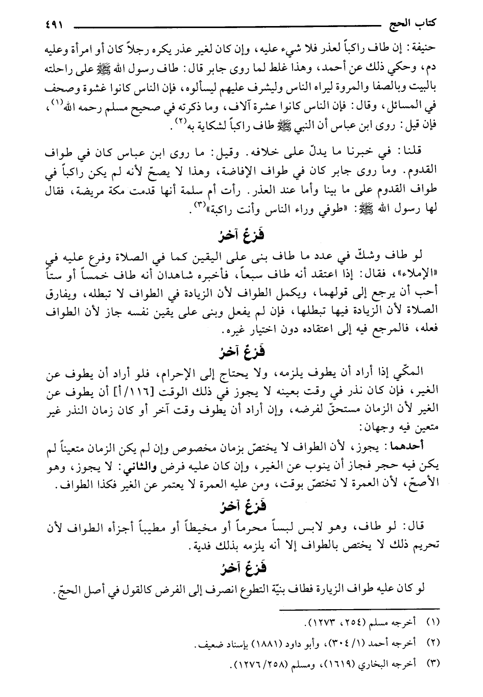 قلنا: في خبرنا ما يدلّ على خلافه. وقيل: ما روى ابن عباس كان في طواف القدوم. وما روى جابر كان في طواف الإفاضة، وهذا لا يصحّ لأنه لم يكن راكبًا في طواف القدوم على ما بينا وأما عند العذر. رأت أم سلمة أنها قدمت مكة مريضة، فقال لها رسول الله صلى الله عليه وسلم: «طوفي وراء الناس وأنت راكبة» (¬3).