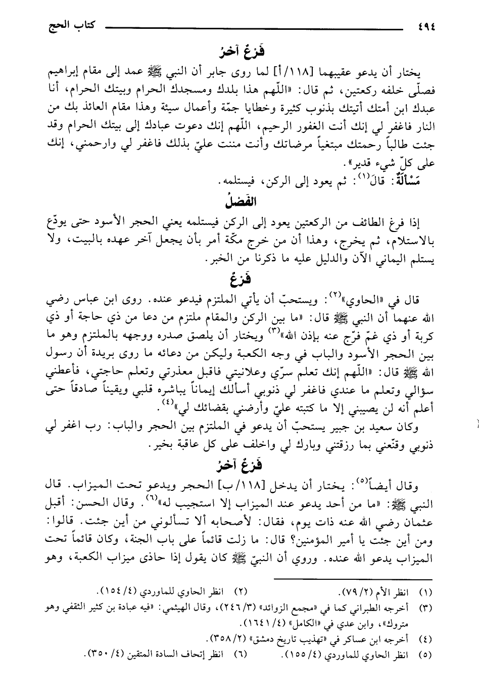 وقال أيضًا (¬5): يختار أن يدخل [118/ ب] الحجر ويدعو تحت الميزاب. قال النبي صلى الله عليه وسلم: «ما من أحد يدعو عن الميزاب إلا استجيب له» (¬6). وقال الحسن: أقبل عثمان رضي الله عنه ذات يوم، فقال: لأصحابه ألا تسألوني من أين جئت. قالوا: ومن أين جئت يا أمير المؤمنين؟ قال: ما زلت قائمًا على باب الجنة، وكان قائمًا تحت الميزاب يدعو الله عنده. وروي أن النبيّ صلى الله عليه وسلم كان يقول إذا حاذى ميزاب الكعبة، وهو