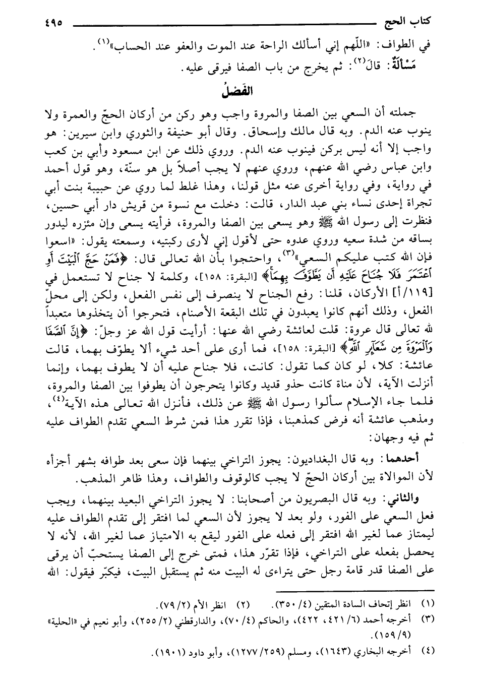 جملته أن السعي بين الصفا والمروة واجب وهو ركن من أركان الحجّ والعمرة ولا ينوب عنه الدم. وبه قال مالك وإسحاق. وقال أبو حنيفة والثوري وابن سيرين: هو واجب إلا أنه ليس بركن فينوب عنه الدم. وروي ذلك عن ابن مسعود وأبي بن كعب وابن عباس رضي الله عنهم، وروي عنهم لا يجب أصلًا بل هو سنّة، وهو قول أحمد في رواية، وفي رواية أخرى عنه مثل قولنا، وهذا غلط لما روي عن حبيبة بنت أبي تجراة إحدى نساء بني عبد الدار، قالت: دخلت مع نسوة من قريش دار أبي حسين، فنظرت إلى رسول الله صلى الله عليه وسلم وهو يسعى بين الصفا والمروة، فرأيته يسعى وإن مئزره ليدور بساقه من شدة سعيه وروي عدوه حتى لأقول إني لأرى ركبتيه، وسمعته يقول: «اسعوا فإن الله كتب عليكم السعي» (¬3)، واحتجوا بأن الله تعالى قال: {فَمَنْ حَجَّ الْبَيْتَ أَوِ اعْتَمَرَ فَلَا جُنَاحَ عَلَيْهِ أَنْ يَطَّوَّفَ بِهِمَا} [البقرة: 158]، وكلمة لا جناح لا تستعمل في [119/ أ] الأركان، قلنا: رفع الجناح لا ينصرف إلى نفس الفعل، ولكن إلى محلّ الفعل، وذلك أنهم كانوا يعبدون في تلك البقعة الأصنام، فتحرجوا أن يتخذوها متعبدًا لله تعالى قال عروة: قلت لعائشة رضي الله عنها: أرأيت قول الله عز وجلّ: {إِنَّ الصَّفَا وَالْمَرْوَةَ مِنْ شَعَائِرِ اللَّهِ} [البقرة: 158]، فما أرى على أحد شيء ألا يطوّف بهما، قالت عائشة: كلا، لو كان كما تقول: كانت، فلا جناح عليه أن لا يطوف بهما، وإنما أنزلت الآية، لأنن مناة كانت حذو قديد وكانوا يتحرجون أن يطوفوا بين الصفا والمروة، فلما جاء الإسلام سألوا رسول الله صلى الله عليه وسلم عن ذلك، فأنزل الله تعالى هذه الآية (¬4)، ومذهب عائشة أنه فرض كمذهبنا، فإذا تقرر هذا فمن شرط السعي تقدم الطواف عليه ثم فيه وجهان: