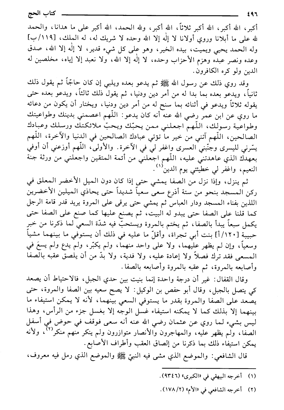 ثم ينزل، وإذا نزل من الصفا يمشي حتى إذا كان دون الميل الأخضر المعلق في ركن المسجد بنحو من ستة أذرع سعى سعيًا شديدًا حتى يحاذي الميلين الأخضرين اللذين بفناء المسجد ودار العباس ثم يمشي حتى يرقى على المروة يريد قدر قامة الرجل كما قلنا على الصفا حتى يبدو له البيت، ثم يصنع عليها كما صنع على الصفا حتى يكمل سبعًا يبدأ بالصفا، ثم يختم بالمروة ويستحبّ فيه شدّة السعي لما ذكرنا من خبر حبيبة [120/ أ] بنت أبي تجراة، وأقلّ ما عليه في ذلك أن يستوفي ما بينهما مشيًا وسعيًا، وإن لم يظهر عليهما، ولا على واحد منهما، ولم يكبّر، ولم يدع ولم يسعَ في المسعى فقد ترك فصلًا ولا إعادة عليه، ولا فدية، ولا بدّ من أن يلصق عقبه بالصفا أصابعه بالمروة، ثم عقبه بالمروة وأصابعه بالصفا.