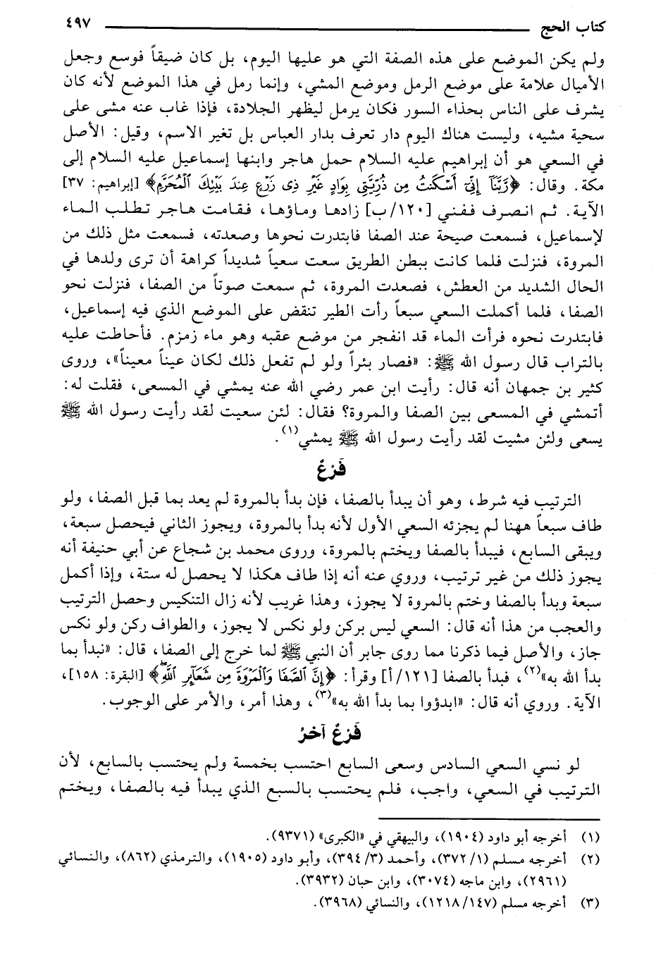 ولم يكن الموضع على هذه الصفة التي هو عليها اليوم، بل كان ضيقًا فوسع وجعل الأميال علامة على موضع الرمل وموضع المشي، وإنما رمل في هذا الموضع لأنه كان يشرف على الناس بحذاء السور فكان يرمل ليظهر الجلادة، فإذا غاب عنه مشى على سحية مشيه، وليست هناك اليوم دار تعرف بدار العباس بل تغير الاسم، وقيل: الأصل في السعي هو أن إبراهيم عليه السلام حمل هاجر وابنها إسماعيل عليه السلام إلى مكة. وقال: {رَبَّنَا إِنِّي أَسْكَنْتُ مِنْ ذُرِّيَّتِي بِوَادٍ غَيْرِ ذِي زَرْعٍ عِنْدَ بَيْتِكَ الْمُحَرَّمِ} [إبراهيم: 37] الآية. ثم انصرف ففني [120/ ب] زادها وماؤها، فقامت هاجر تطلب الماء لإسماعيل، فسمعت صيحة عند الصفا فابتدرت نحوها وصعدته، فسمعت مثل ذلك من المروة، فنزلت فلما كانت ببطن الطريق سعت سعيًا شديدًا كراهة أن ترى ولدها في الحال الشديد من العطش، فصعدت المروة، ثم سمعت صوتًا من الصفا، فنزلت نحو الصفا، فلما أكملت السعي سبعًا رأت الطير تنقض على الموضع الذي فيه إسماعيل، فابتدرت نحوه فرأت الماء قد انفجر من موضع عقبه وهو ماء زمزم. فأحاطت عليه بالتراب قال رسول الله صلى الله عليه سولم: «فصار بئرًا ول لم تفعل ذلك لكان عينًا معينًا»، وروى كثير بن جمهان أنه قال: رأيت ابن عمر رضي الله عنه يمشي في المسعى، فقلت له: أتمشي في المسعى بين الصفا والمروة؟ فقال: لئن سعيت لقد رأيت رسول الله صلى الله عليه وسلم يسعى ولئن مشيت لقد رأيت رسول الله صلى الله عليه وسلم يمشي (¬1).