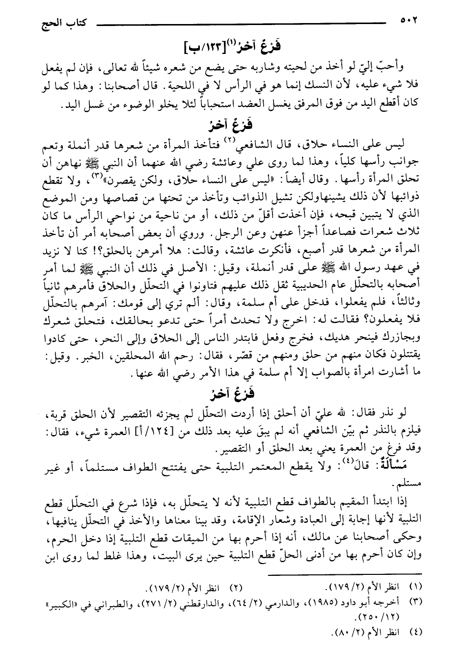 وأحبّ إليّ لو أخذ من لجيته وشاربه حتى يضع من شعره شيئًا لله تعالى, فإن لم يفعل فلا شيء عليه, لأن النسك إنما هو في الرأس لا في اللحية. قال أصحابنا: وهذا كما لو كان أقطع اليد من فوق المرفق يغسل العضد استحبابًا لئلا يخلو الوضوء من غسل اليد.