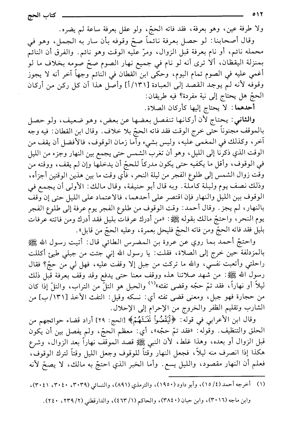 واحتجّ أحمد بما روي عن عروة بن المضرس الطائي قال: أتيت رسول الله صلى الله عليه وسلم بالمزدلفة حين خرج إلى الصلاة، فقلت: يا رسول الله إني جئت من جبلي طيئ أكللت راحلتي وأتعبت نفسي، والله ما تركت من جبل إلا وقفت عليه، فهل لي من حجّ؟ فقال رسول الله صلى الله عليه وسلم: من شهد صلاتنا هذه ووقف معنا حتى يدفع وقد وقف بعرفة قبل ذلك ليلًا أو نهارًا، فقد تم حجه وقضى ثفته" (¬1) والحبل هو التلّ من التراب، والتلّ إذا كان من حجارة فهو جبل، ومعنى قضى ثفته أي: نسكه وقيل: التفث الأخذ [131/ب] من الشارب وتقليم الظفر والخروج من الإحرام إلى الإحلال.