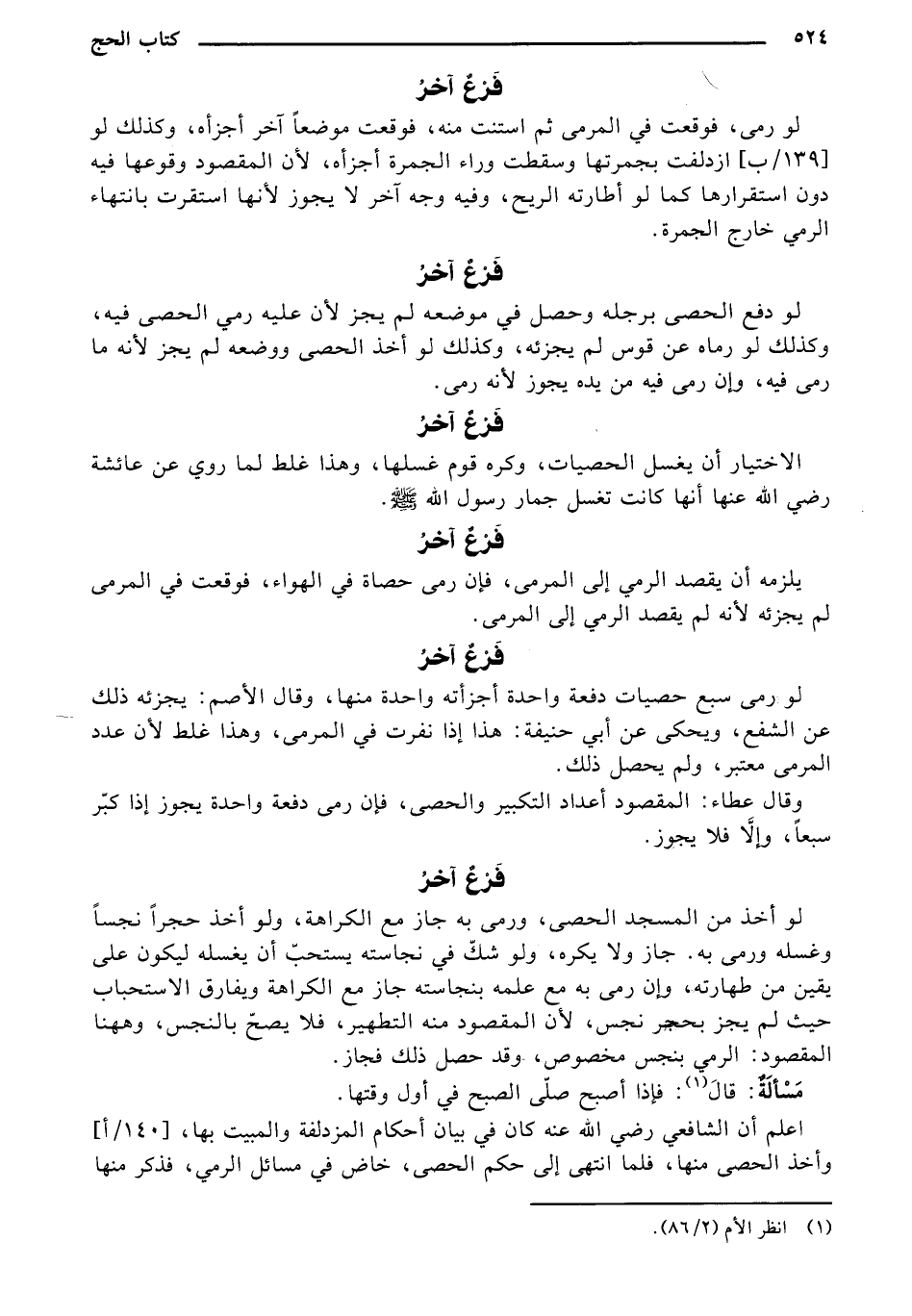 اعلم أن الشافعي رضي الله عنه كان في بيان أحكام المزدلفة والمبيت بها, [140/ أ] وأخذ الحصى منها, فلما انتهى إلى حكم الحصى, خاض في مسائل الرمي, فذكر منها