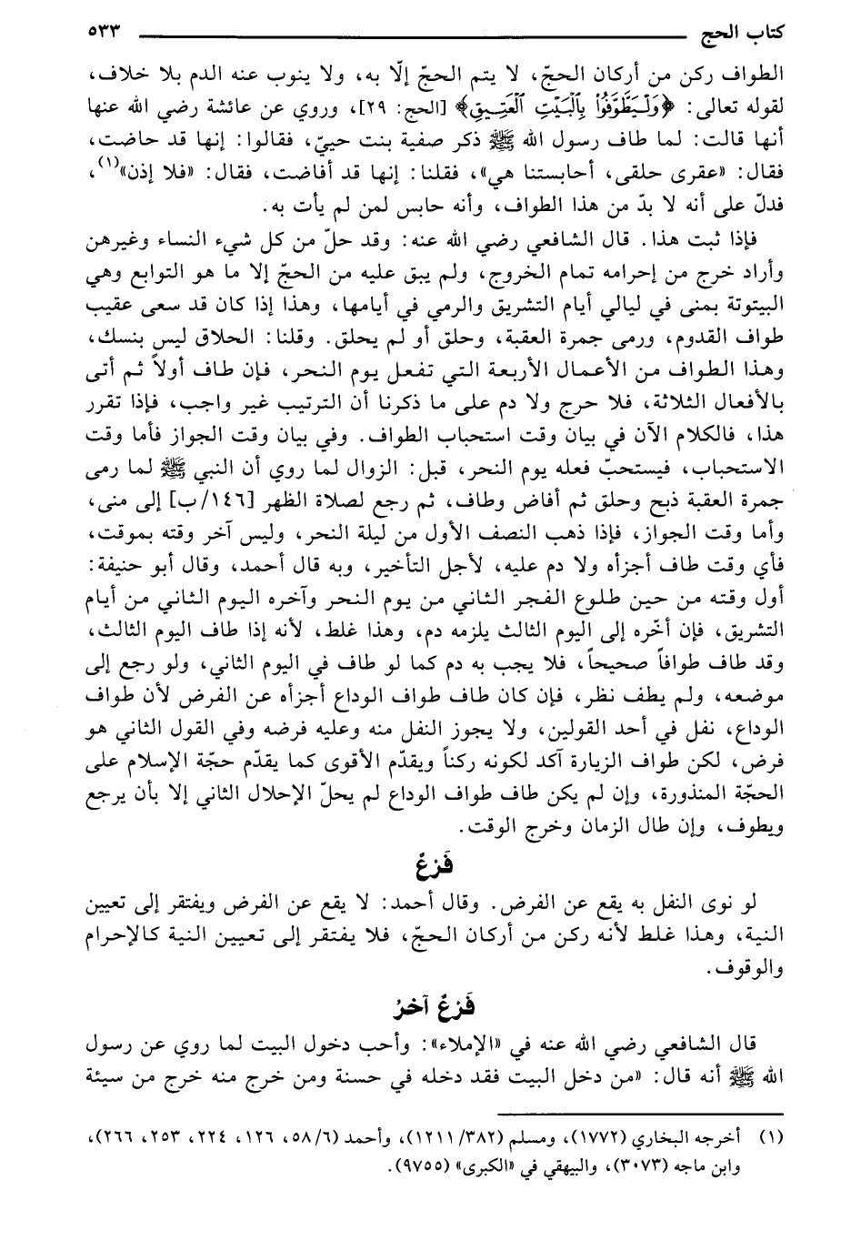 الطواف ركن من أركان الحجّ، لا يتم الحجّ إلا به، ولا ينوب عنه الدم بلا خلاف، لقوله تعالي: (وليطوفوا بالبيت العتيق) [الحج: 29]،وروي عن عائشة رضي الله عنها أنها قالت: لما طاف رسول الله صلي الله عليه وسلم ذكر صفية بنت حييّ، فقالوا: إنها حاضت، فقال: ((عقري حلقي، أحابستنا هي))،فقلنا: إنها قد أفاضت، فقال: ((فلا إذن)) (¬1)،فدلّ علي إنه لابدّ من هذا الطواف، وأنه حابس لمن لم يأت به. فإذا ثبت هذا. قال الشافعي رضي الله عنه: وقد حلّ من كل شيء إلا النساء وغيرهن وأراد خرج من إحرامه تمام الخروج، ولم يبق عليه من الحجّ إلا ما هو التوابع وهي البيتوتة بمني في ليالي أيام التشريق والرمي في أيامها، وهذا إذا كان قد سعى عقيب طواف القدوم، ورمي جمرة العقبة، وحلق أو لم يحلق. وقلنا: الحلاق ليس بنسك، وهذا الطواف من الأعمال الأربعة التي تفعل يوم النحر، فأن طاف أولًا ثم أتي بالأفعال الثلاثة فلا حرج ولا دم علي ما ذكرنا أن الترتيب غير واجب، فإذا تقرر هذا، فالكلام الآن في بيان وقت استحباب الطواف. وفي بيان وقت الجواز فإما وقت الاستحباب، فيستحبّ فعله يوم النحر، قبل: الزوال لما روي أن النبي صلي الله عليه وسلم لما رمي جمرة العقبة ذبح وحلق ثم أفاض وطاف، ثم رجع لصلة الظهر [146/ ب] إلي مني، وأما وقت الجواز، فإذا ذهب النصف الأول من ليلة النحر، وليس آخر وقته بموقت، فأي وقت طاف أجزأه ولا دم عليه، لأجل التأخير، وبه قال أحمد، وقال أبو حنيفة: أول وقته من حين طلوع الفجر الثاني من يوم النحر وآخره اليوم الثاني من أيام التشريق، فإن أخّره إلي اليوم الثالث يلزمه دم، وهذا غلط، لأنه إذا طاف اليوم الثالث، وقد طاف طوافًا صحيحًا، فلا يجب به دم كما لو طاف في اليوم الثاني، ولو رجع إلي موضعه، ولم يطف نظر، فإن كان طاف طواف الوداع أجزأه عن الفرض لأن طواف الوداع، نفل في أحد القولين، ولا يجوز النفل منه وعليه وفي القول الثاني هو فرض، لكن طواف الزيارة آكد لكونه ركنا ويقدّم الأقوى كما يقدّم حجّة الإسلام علي الحجّة المنذورة، وإن لم يكن طاف طواف الوداع لم يحلّ الإحلال الثاني إلا بأن يرجع ويطوف، وإن طال الزمان وخرج الوقت.