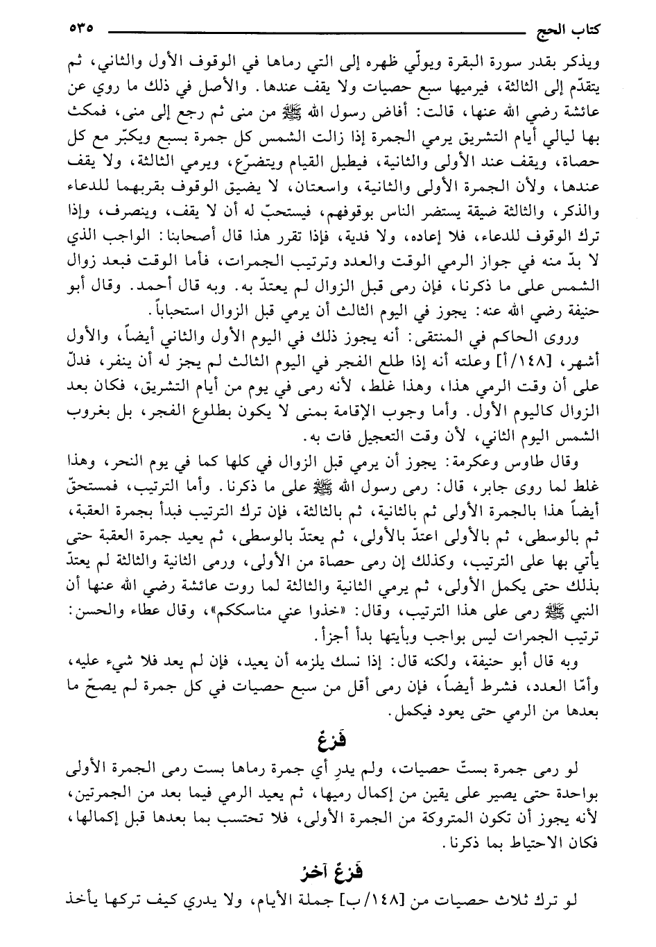 وروي الحاكم في المنتقي: أنه يجوز ذلك في اليوم الأول والثاني أيضاّ، والأول أشهر، [148/ أ] وعلته أنه إذا طلع الفجر في اليوم الثالث لم يجز له أن ينفر، فدلّ علي أن وقت الرمي هذا، وهذا غلط، لأنه رمي في يوم من أيام التشريق، فكان بعد الزوال كاليوم الأول. وأما وجوب الإقامة بمني لا يكون بطلوع الفجر، بل بغروب الشمس اليوم الثاني، لأن وقت التعجيل فات به.