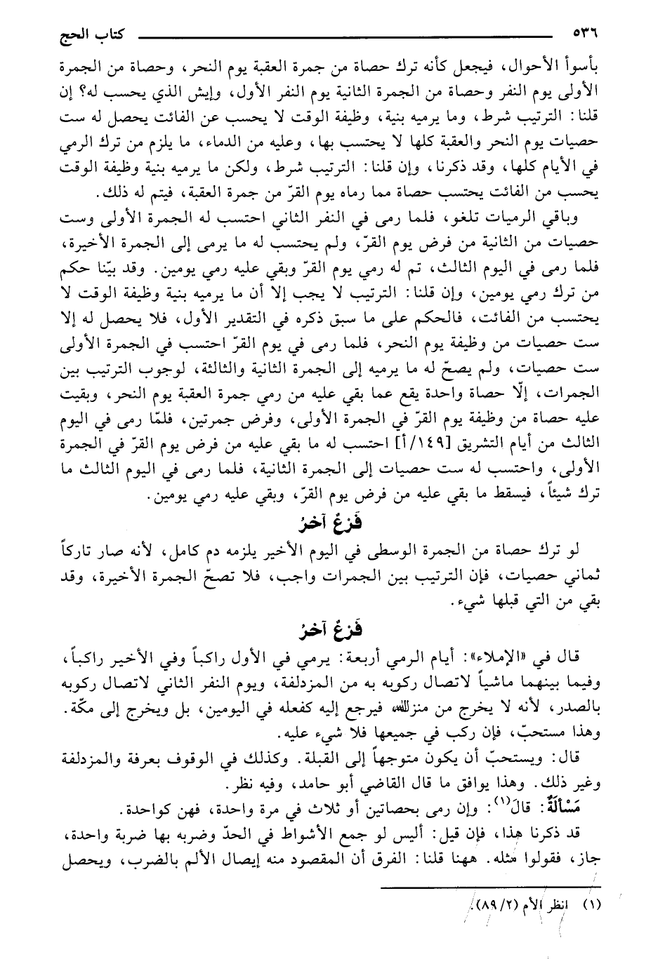 وباقي الريات تلغو، فلما رمي في النفر الثاني احتسب له الجمرة الأولي وست حصسات من الثانية من فرض يوم القرّ، ولم يحتسب له مايرمي إلي الجمرة الأخيرة، فلما رمي في اليوم الثالث، تم له رمي يوم القرّ وبقي عليه رمي يومين. وقد بيّنا حكم من ترك رمي يومين، وإن قلنا: الترتيب لا يجب إلا أن ما يرميه بنيه وظيفة الوقت لا يحتسب من الفائت، فالحكم علي ما سبق ذكره في التقدير الأول، فلا يحصل له إلا ست حصيات من وظيفة يوم النحر، فلما رمي في يوم القرّ احتسب في الجمرة الأولي ست حصيات، ولم يصحّ له ما يرميه إلي الجمرة الثانية والثالثة، لوجوب الترتيب بين الجمات، إلّا حصاة واحدة يقع عما بقي عليه من رمي جمرة العقبة يوم النحر، وبقيت عليه حصاة من وظيفة يوم القرّ في الجمرة الأولي، وفرض جمرتين، فلما رمي في اليوم الثالث من أيام التشريق [149/ أ] احتسب له ما بقي علي من فرض يوم القرّ في الجمرة الأولي، واحتسب له ست حصيات إلي الجمرة الثانية، فلما رمي في اليوم الثالث ما ترك شيئًا، فيسقط ما بقي عليه من فرض يوم القرّ، وبقي عليه من رمي يومين.
