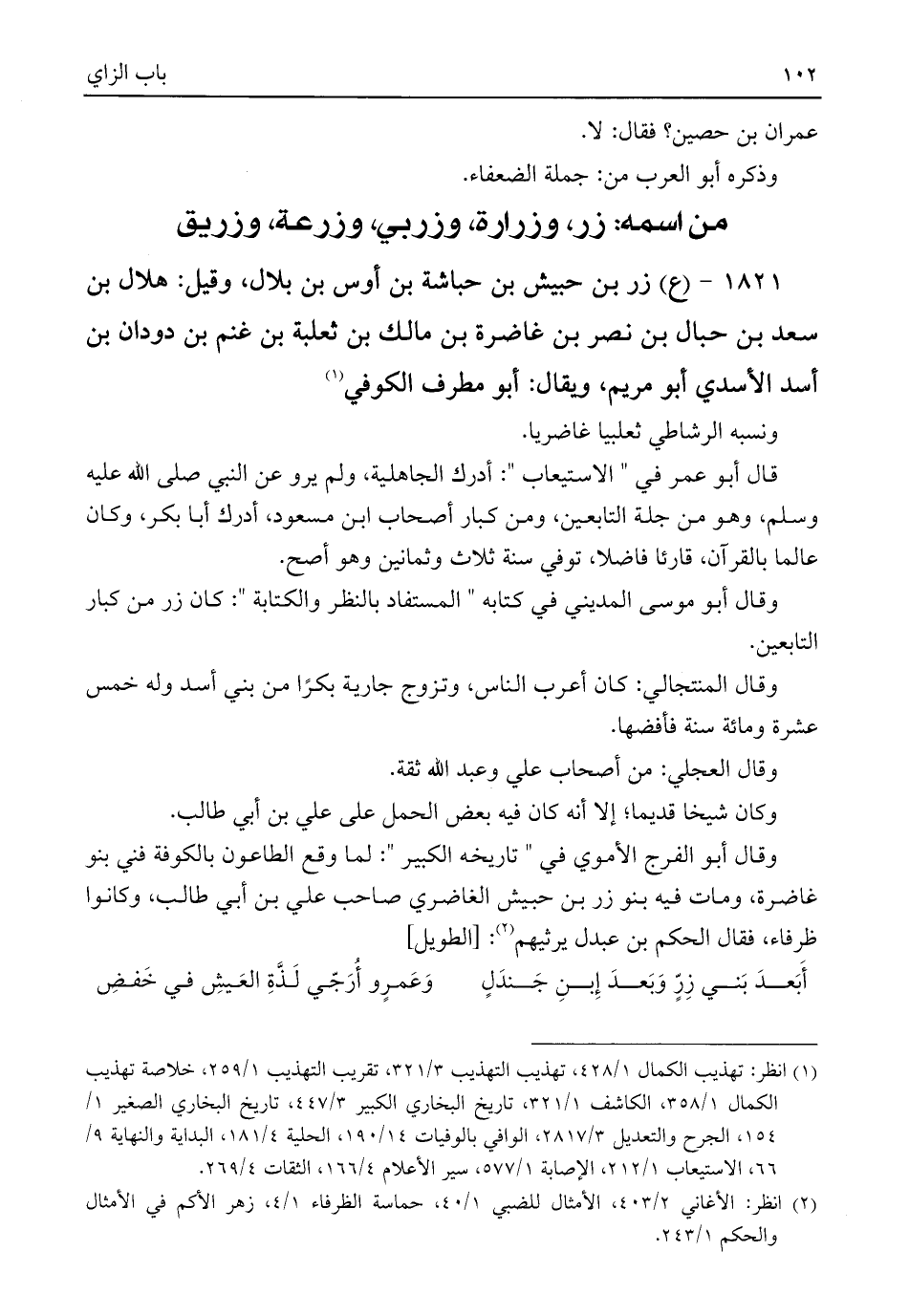 ١٨٢١ - (ع) زر بن حبيش بن حباشة بن أوس بن بلال، وقيل: هلال بن سعد بن حبال بن نصر بن غاضرة بن مالك بن ثعلبة بن غنم بن دودان بن أسد الأسدي أبو مريم، ويقال: أبو مطرف الكوفي (¬١)
