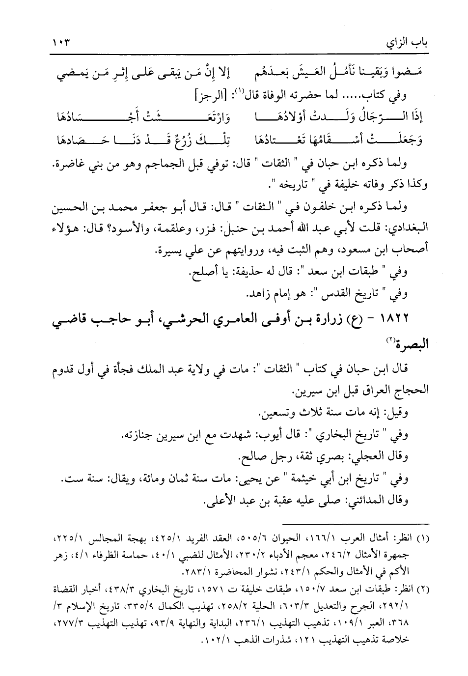 ١٨٢٢ - (ع) زرارة بن أوفى العامري الحرشي، أبو حاجب قاضي البصرة (¬٢)