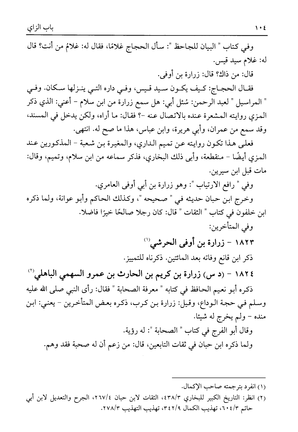 فقال الحجاج: كيف يكون سيد قيس، وفي داره التي ينزلها سكان. وفي "المراسيل" لعبد الرحمن: سُئل أبي: هل سمع زرارة من ابن سلام -أعني: الذي ذكر المزي روايته المشعرة عنده بالاتصال عنه-؟ فقال: ما أراه، ولكن يدخل في المسند، وقد سمع من عمران، وأبي هريرة، وابن عباس، هذا ما صح له. انتهى.