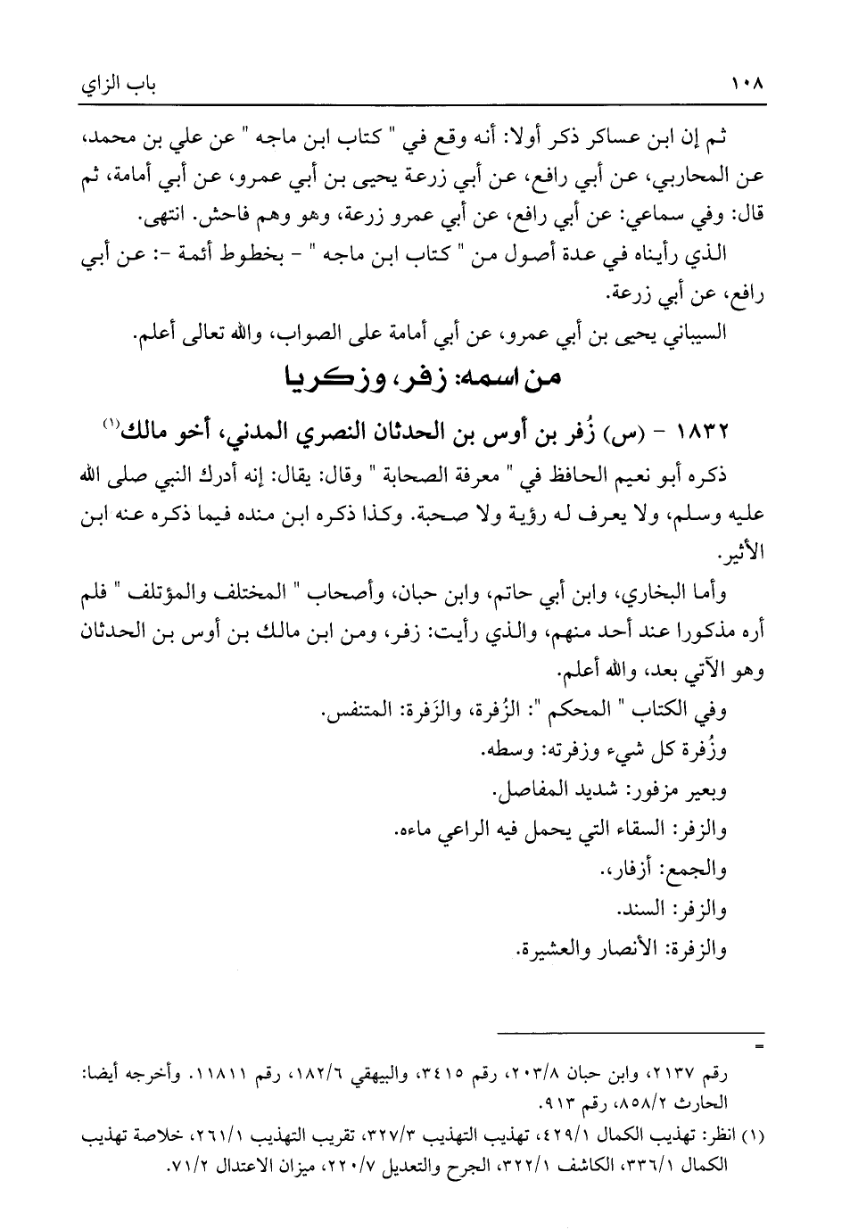 وأما البخاري، وابن أبي حاتم، وابن حبان، وأصحاب "المختلف والمؤتلف" فلم أره مذكورا عند أحد منهم، والذي رأيت: زفر، ومن ابن مالك بن أوس بن الحدثان وهو الآتي بعد، واللَّه أعلم.