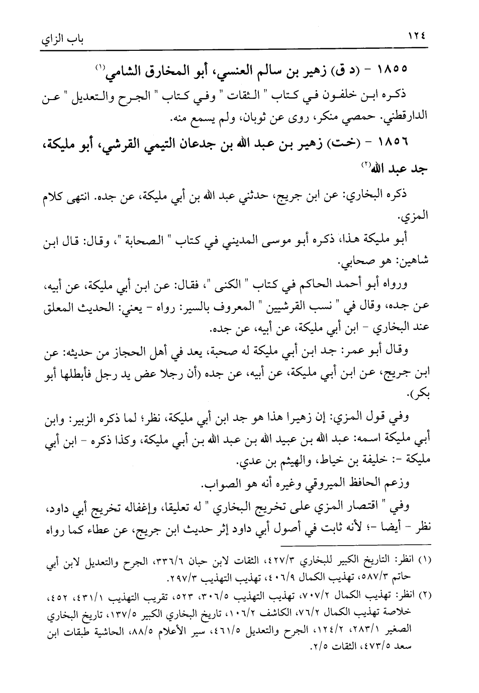 وفي قول المزي: إن زهيرا هذا هو جد ابن أبي مليكة، نظر؛ لما ذكره الزبير: وابن أبي مليكة اسمه: عبد اللَّه بن عبيد اللَّه بن عبد اللَّه بن أبي مليكة، وكذا ذكره -ابن أبي مليكة-: خليفة بن خياط، والهيثم بن عدي.