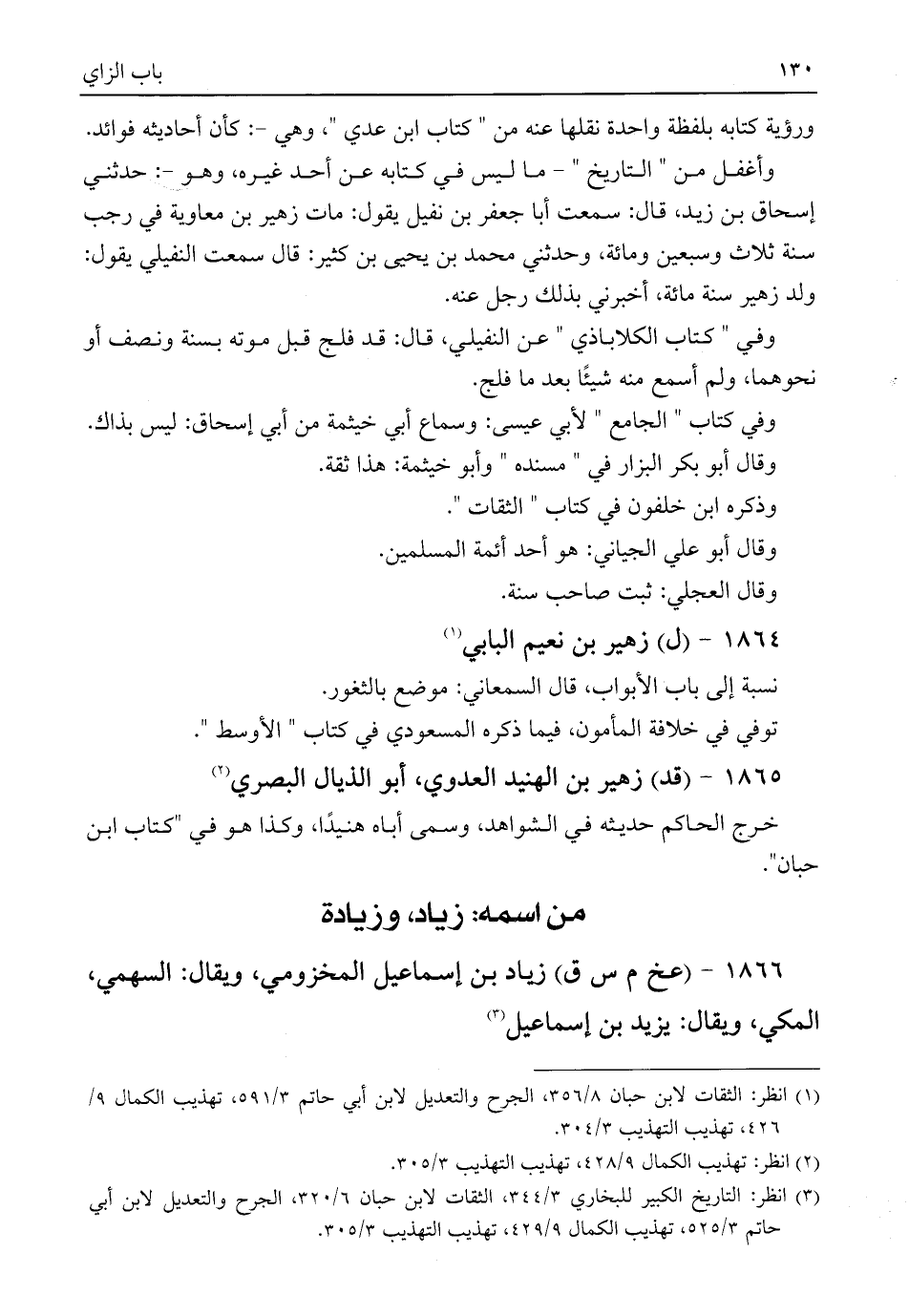 وأغفل من "التاريخ" -ما ليس في كتابه عن أحد غيره، وهو-: حدثني إسحاق بن زيد، قال: سمعت أبا جعفر بن نفيل يقول: مات زهير بن معاوية في رجب سنة ثلاث وسبعين ومائة، وحدثني محمد بن يحيى بن كثير: قال سمعت النفيلي يقول: ولد زهير سنة مائة، أخبرني بذلك رجل عنه.