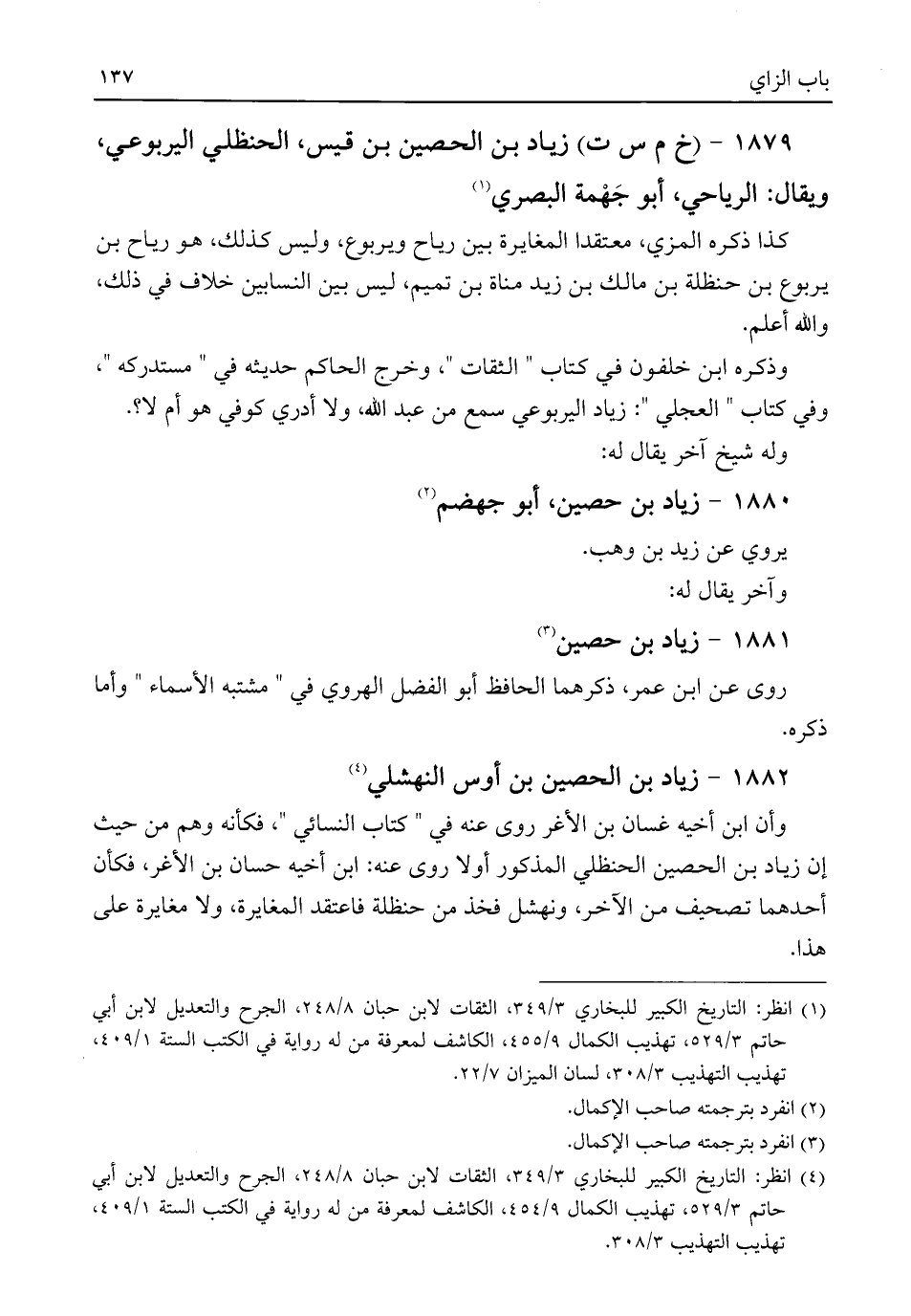 وأن ابن أخيه غسان بن الأغر روى عنه في "كتاب النسائي"، فكأنه وهم من حيث إن زياد بن الحصين الحنظلي المذكور أولا روى عنه: ابن أخيه حسان بن الأغر، فكأن أحدهما تصحيف من الآخر، ونهشل فخذ من حنظلة فاعتقد المغايرة، ولا مغايرة على هذا.