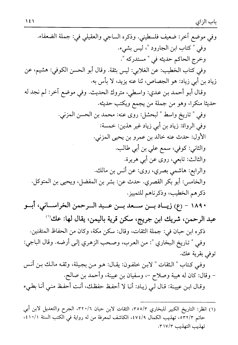 ١٨٩٠ - (ع) زياد بن سعد بن عبد الرحمن الخراساني، أبو عبد الرحمن، شريك ابن جريج، سكن قرية باليمن، يقال لها: عك (¬١)