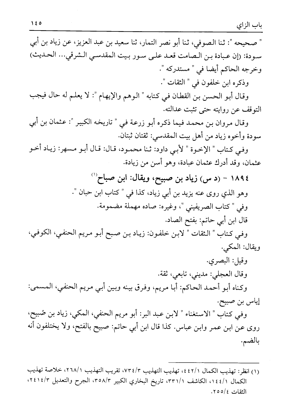 وفي كتاب "الاستغناء" لابن عبد البر: أبو مريم الحنفي، المكي، زياد بن صُبيح، روى عن ابن عمر وابن عباس. كذا قال ابن أبي حاتم: صبيح بالفتح، ولا يختلفون أنه بالضم.