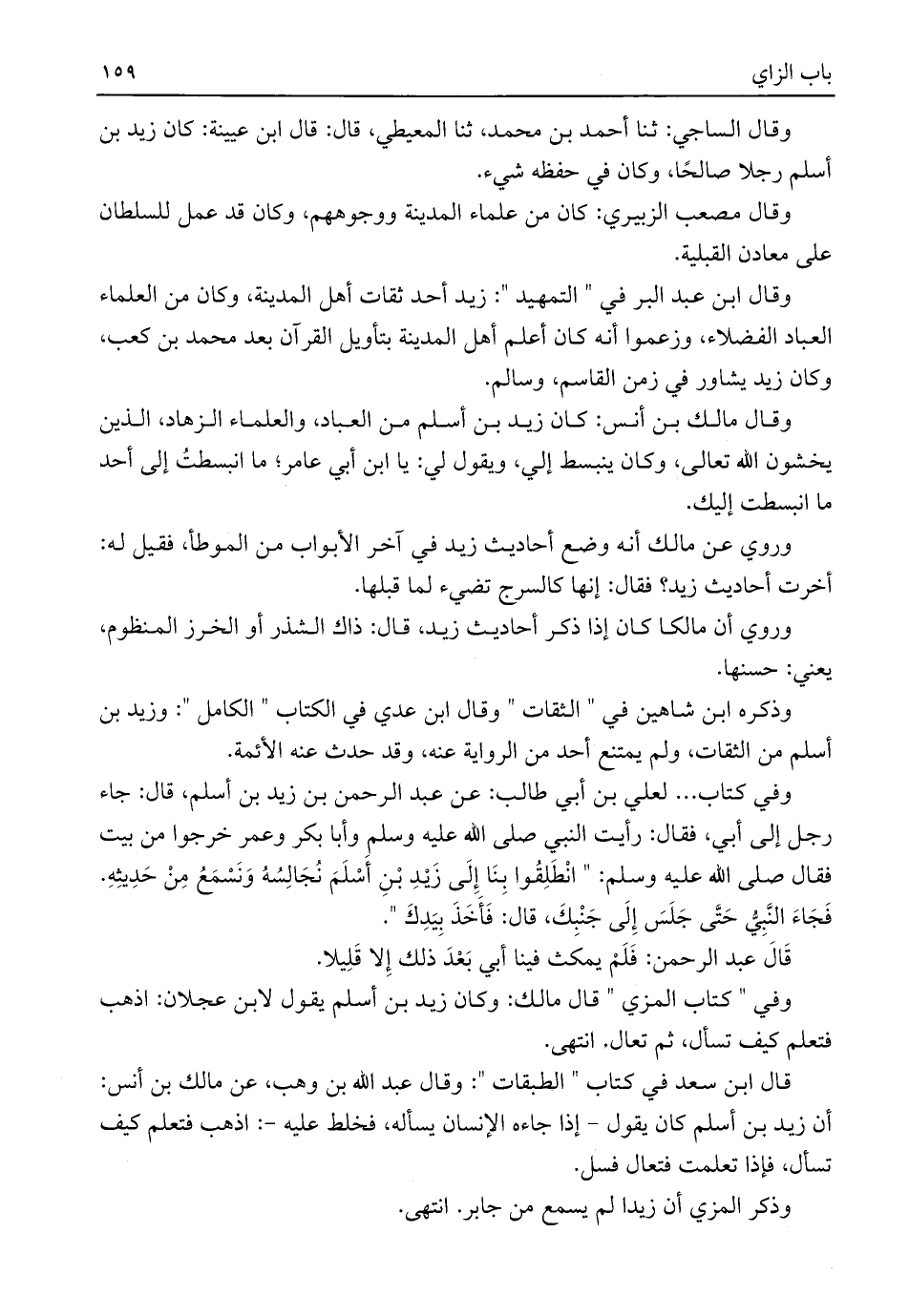وروي أن مالكا كان إذا ذكر أحاديث زيد، قال: ذاك الشذر أو الخرز المنظوم، يعني: حسنها.