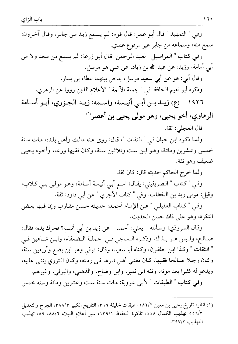 ١٩٢٦ - (ع) زيد بن أبي أنيسة، واسمه: زيد الجزري، أبو أسامة الرهاوي، أخو يحيى، وهو مولى يحيى بن أعصر (¬١)