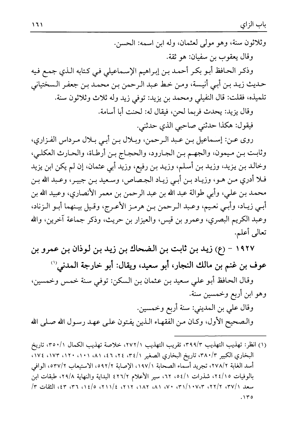 ١٩٢٧ - (ع) زيد بن ثابت بن الضحاك بن زيد بن لوذان بن عمرو بن عوف بن غنم بن مالك النجار، أبو سعيد، ويقال: أبو خارجة المدني (¬١)