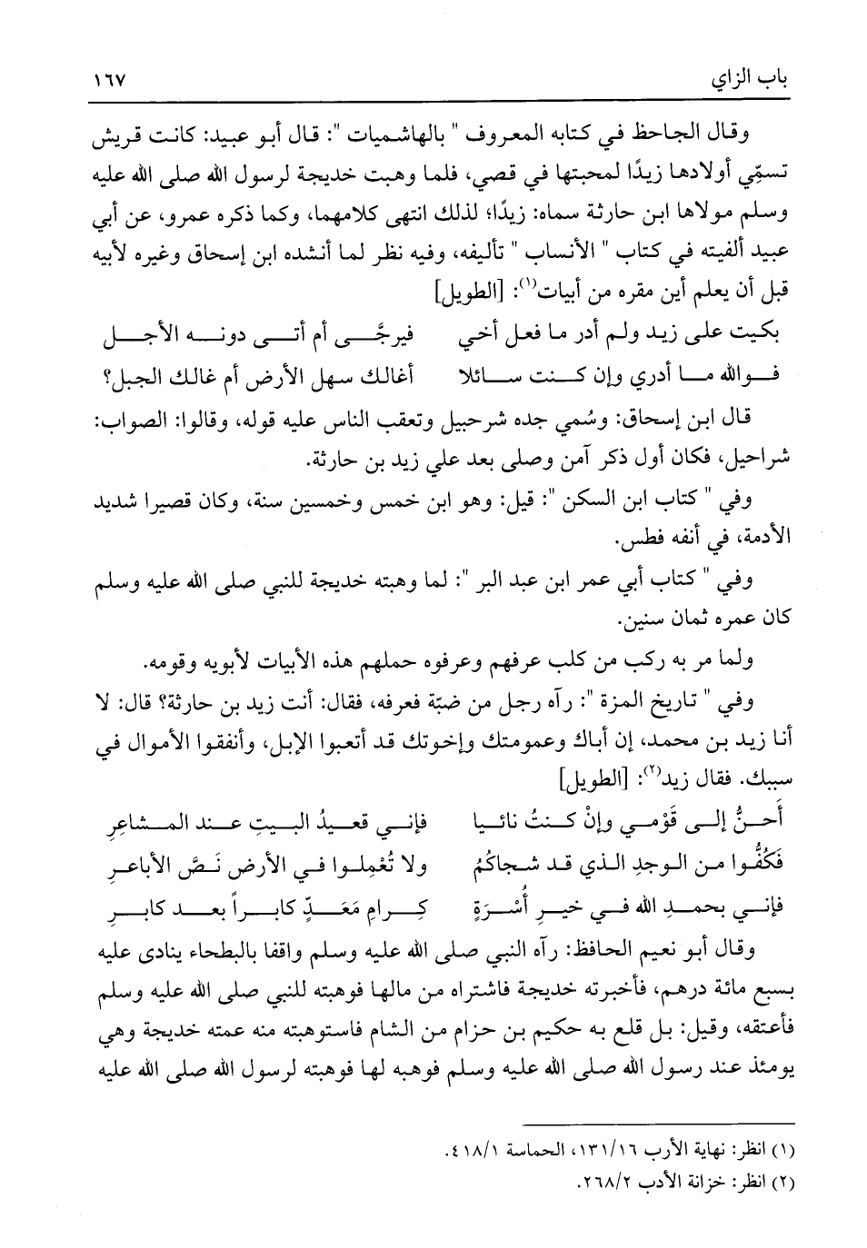 وقال الجاحظ في كتابه المعروف "بالهاشميات": قال أبو عبيد: كانت قريش تسمِّي أولادها زيدًا لمحبتها في قصي، فلما وهبت خديجة لرسول اللَّه صلى اللَّه عليه وسلم مولاها ابن حارثة سماه: زيدًا؛ لذلك انتهى كلامهما، وكما ذكره عمرو، عن أبي عبيد ألفيته في كتاب "الأنساب" تأليفه، وفيه نظر لما أنشده ابن إسحاق وغيره لأبيه قبل أن يعلم أين مقره من أبيات (¬١): [الطويل]