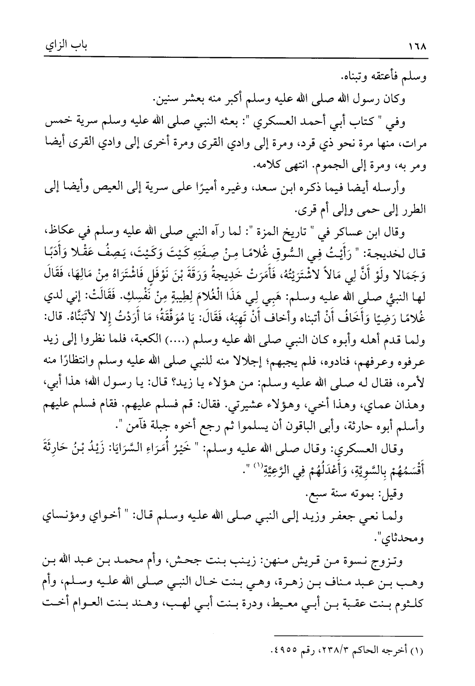 وقال ابن عساكر في "تاريخ المزة": لما رآه النبي صلى اللَّه عليه وسلم في عكاظ، قال لخديجة: "رَأَيْتُ فِي السُّوقِ غُلامًا مِنْ صِفَتِهِ كَيْتَ وَكَيْتَ، يَصِف عَقْلا وَأَدَبًا وَجَمَالا ولَوْ أَنَّ لِي مَالًا لاشْتَرَيْتُهُ، فَأَمَرَتْ خَدِيجةُ وَرَقَةَ بْنَ نَوْفَلٍ فَاشْتَرَاهُ مِنْ مَالِهَا، فَقَالَ لها النبيُّ صلى اللَّه عليه وسلم: هَبِي لِي هَذَا الْغُلامَ لِطِيبةٍ مِنْ نَفْسِكِ. فَقَالَتْ: إني لدي غُلامًا رَضِيًا وَأَخَافُ أَنْ أتبناه وأخاف أَنْ تَهِبَهُ، فَقَالَ: يَا مُوَفَّقَةُ؛ مَا أَرَدْتُ إِلا لأتَبَنَّاهُ. قال: ولما قدم أهله وأبوه كان النبي صلى اللَّه عليه وسلم (. . . .) الكعبة، فلما نظروا إلى زيد عرفوه وعرفهم، فنادوه، فلم يجبهم؛ إجلالا منه للنبي صلى اللَّه عليه وسلم وانتظارًا منه لأمره، فقال له صلى اللَّه عليه وسلم: من هؤلاء يا زيد؟ قال: يا رسول اللَّه؛ هذا أبي، وهذان عماي، وهذا أخي، وهؤلاء عشيرتي. فقال: قم فسلم عليهم. فقام فسلم عليهم وأسلم أبوه حارثة، وأبى الباقون أن يسلموا ثم رجع أخوه جبلة فآمن".
